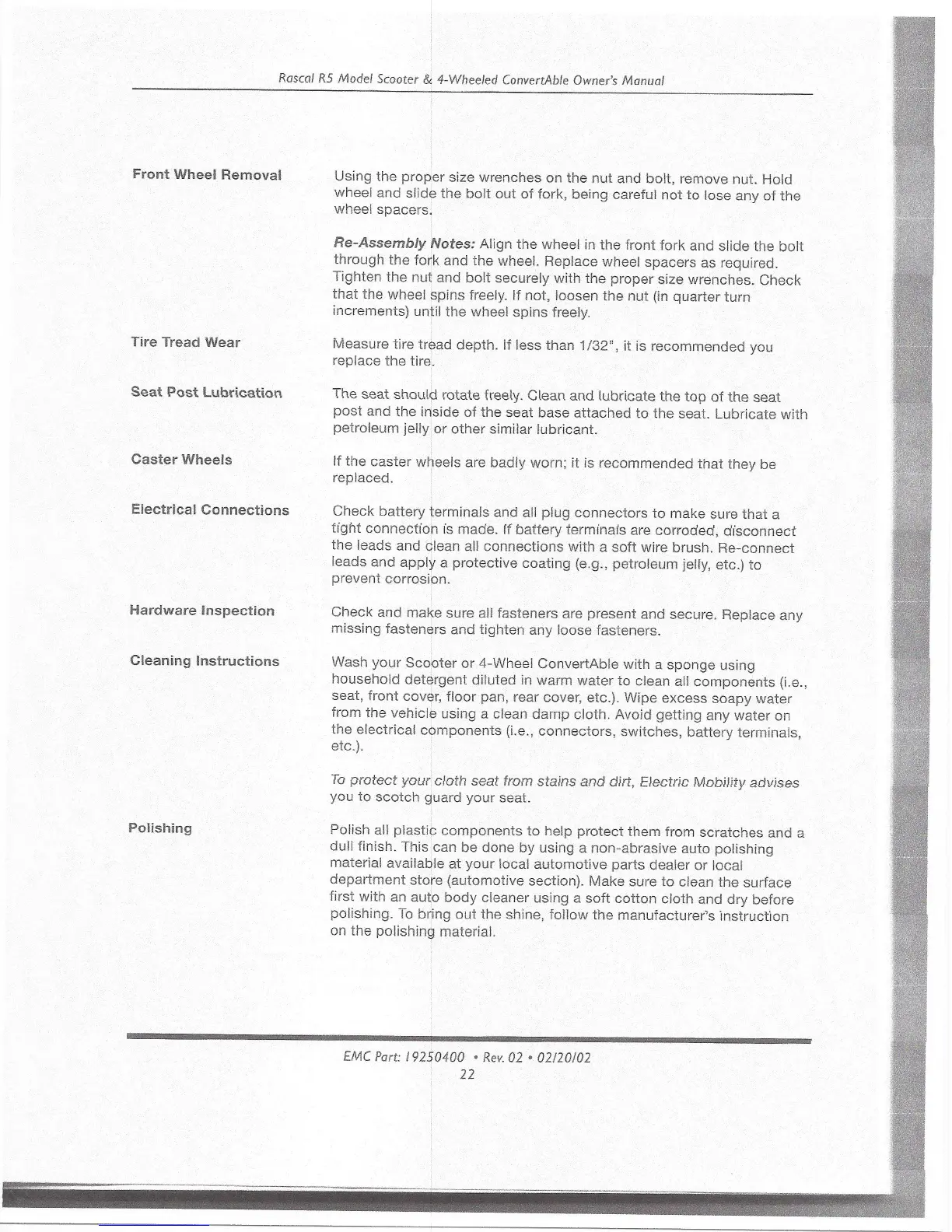 Rascal R205 - Front Wheel Removal; Tire Tread Wear Check; Seat Post Lubrication; Caster Wheels Maintenance