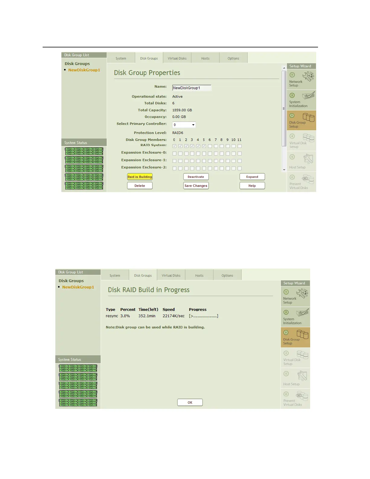 A RAID build is automatically started on the Disk Group when it is created according to the