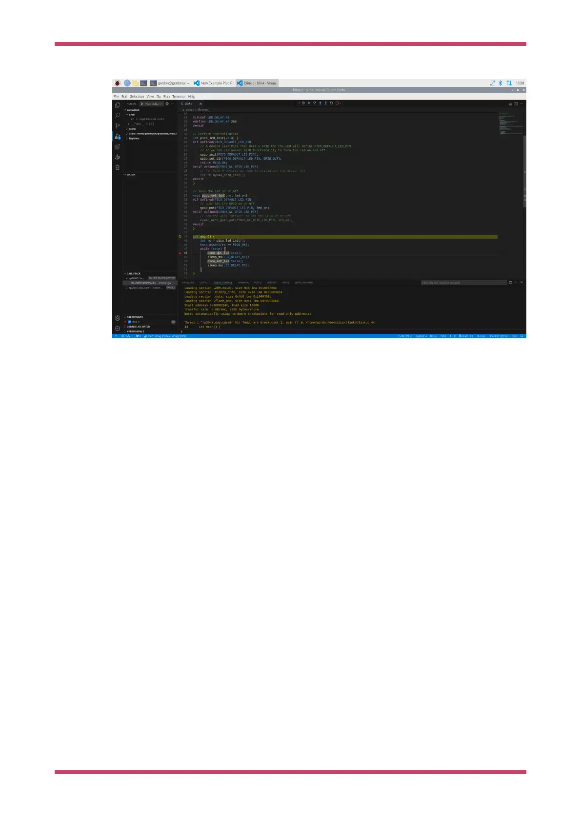Press Run (F5); execution should halt on the breakpoint. Next, press Step-over (F10) and you should see the LED light