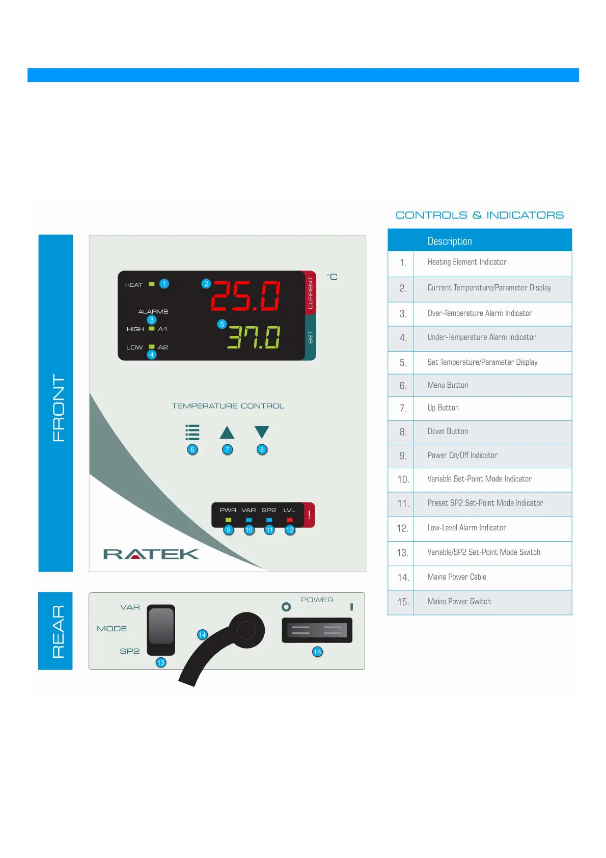 The figure below indicates all key controls and components of the Immersion Heater Circulator with their corresponding numerical