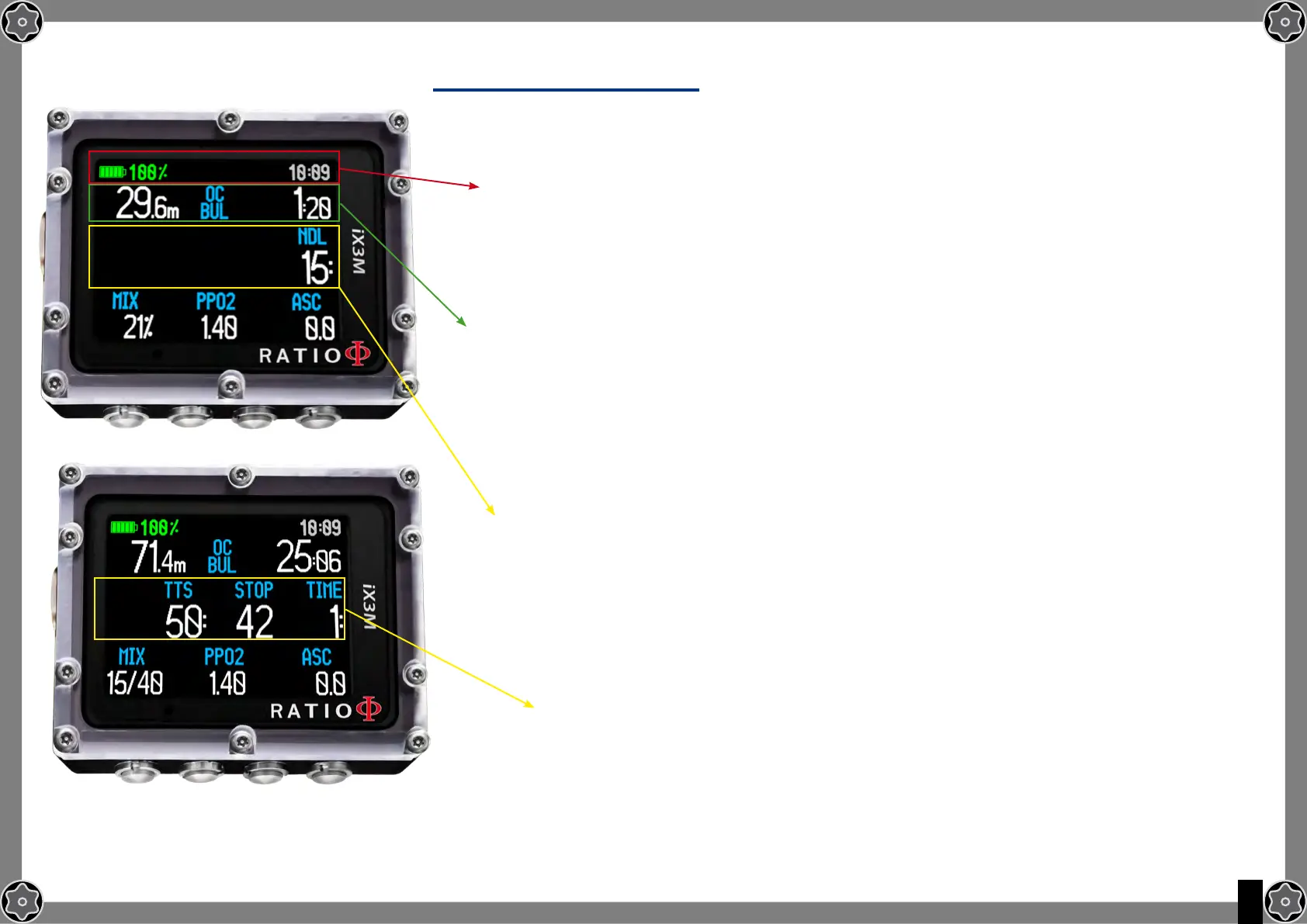 Current depth: (left) With colour alarm code when passing the gas MOD,