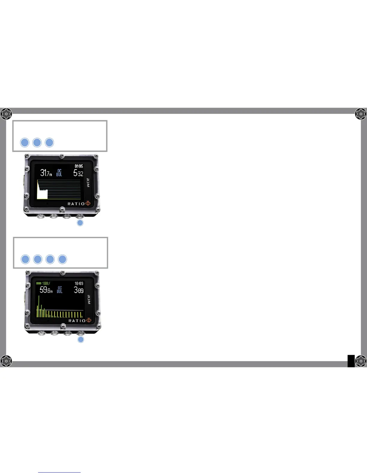 Current depth: (left) with coloured alarm code when passing the gas MOD,