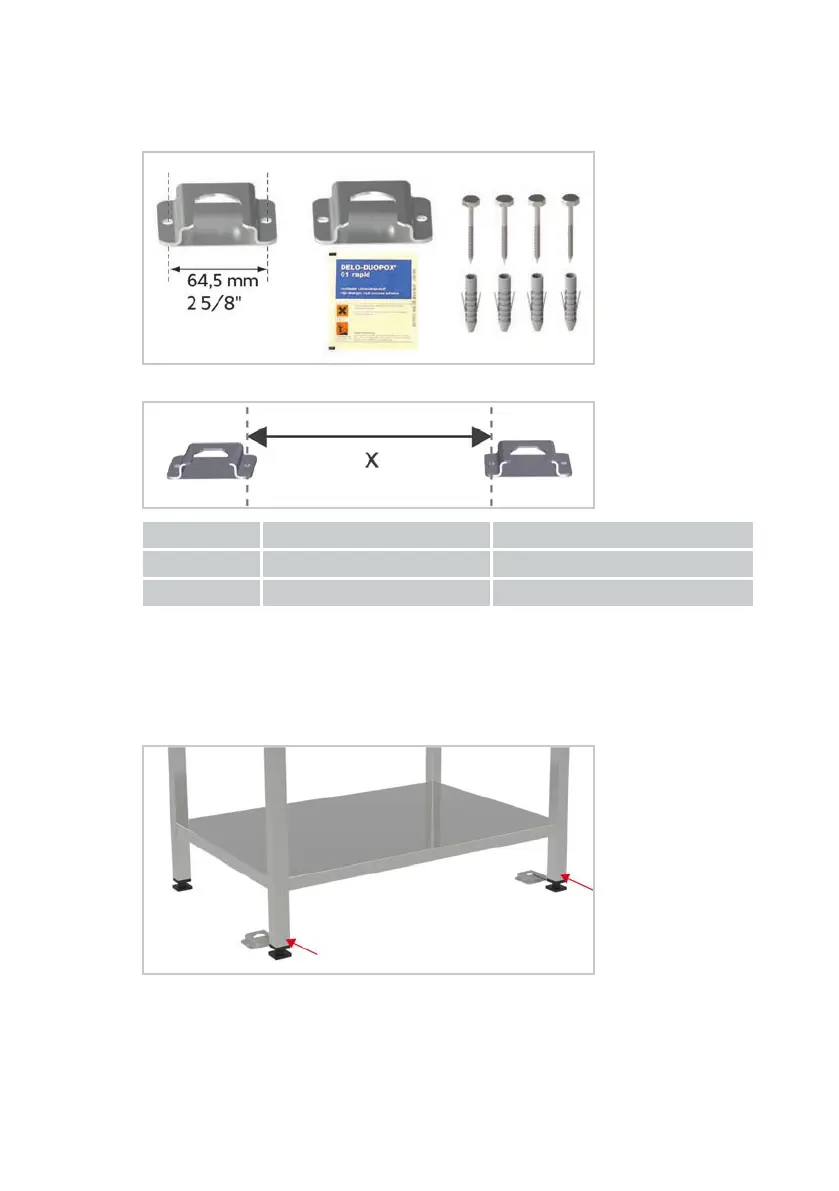 1. Secure the foot locks for the front feet to the floor with the special adhe-