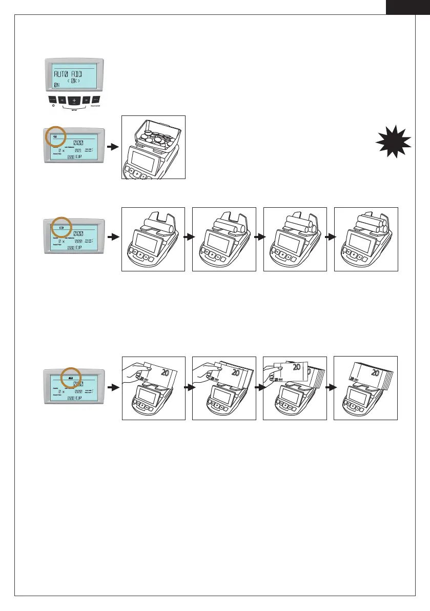 Med den här funktionen kan du räkna (individuellt skapade) mynt och sedlar buntar. I SETUP-menyn kan du välja