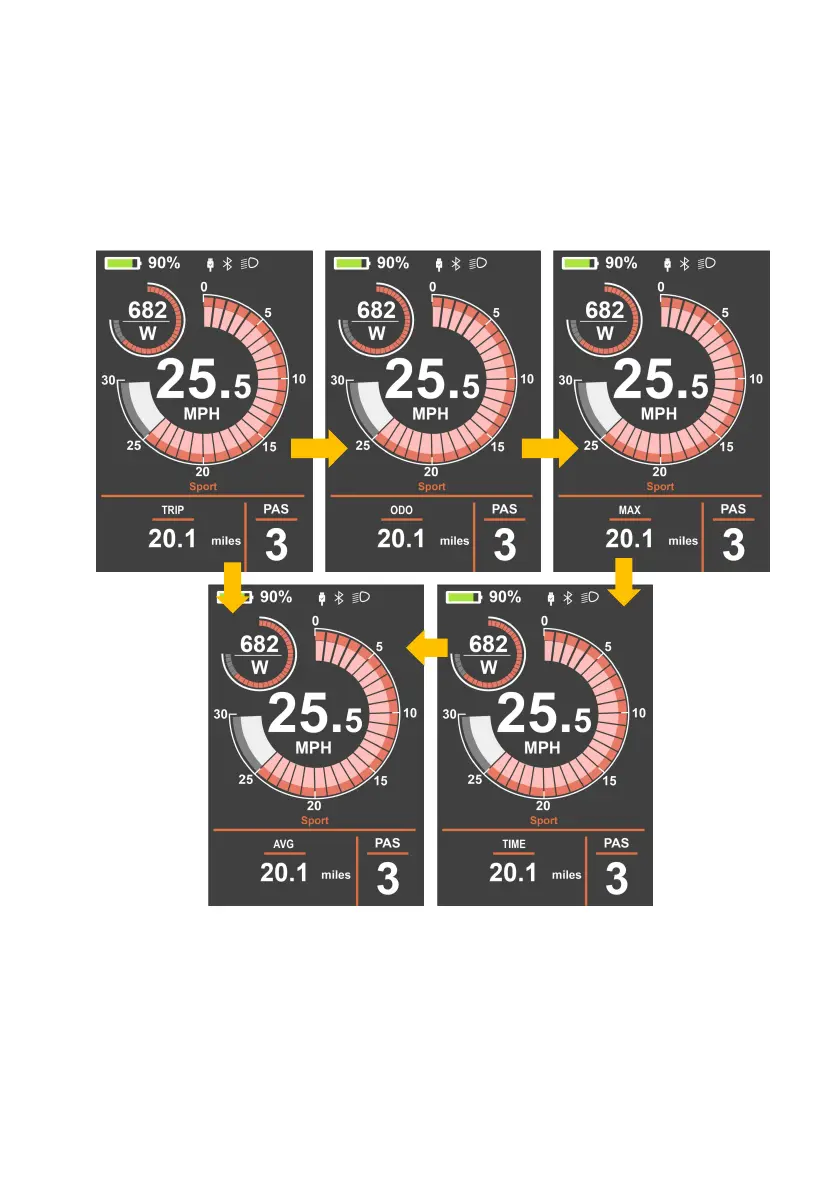 default, press the "i" for 2~3S to switch ODO (Km), Max (Km/h), Avg