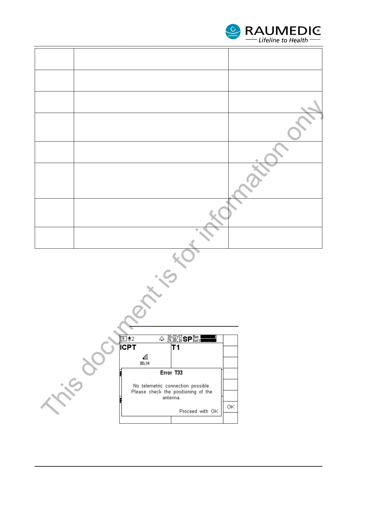 displayed. If no telemetric connection is built up within 30 s, the fault message T33 is displayed, and a