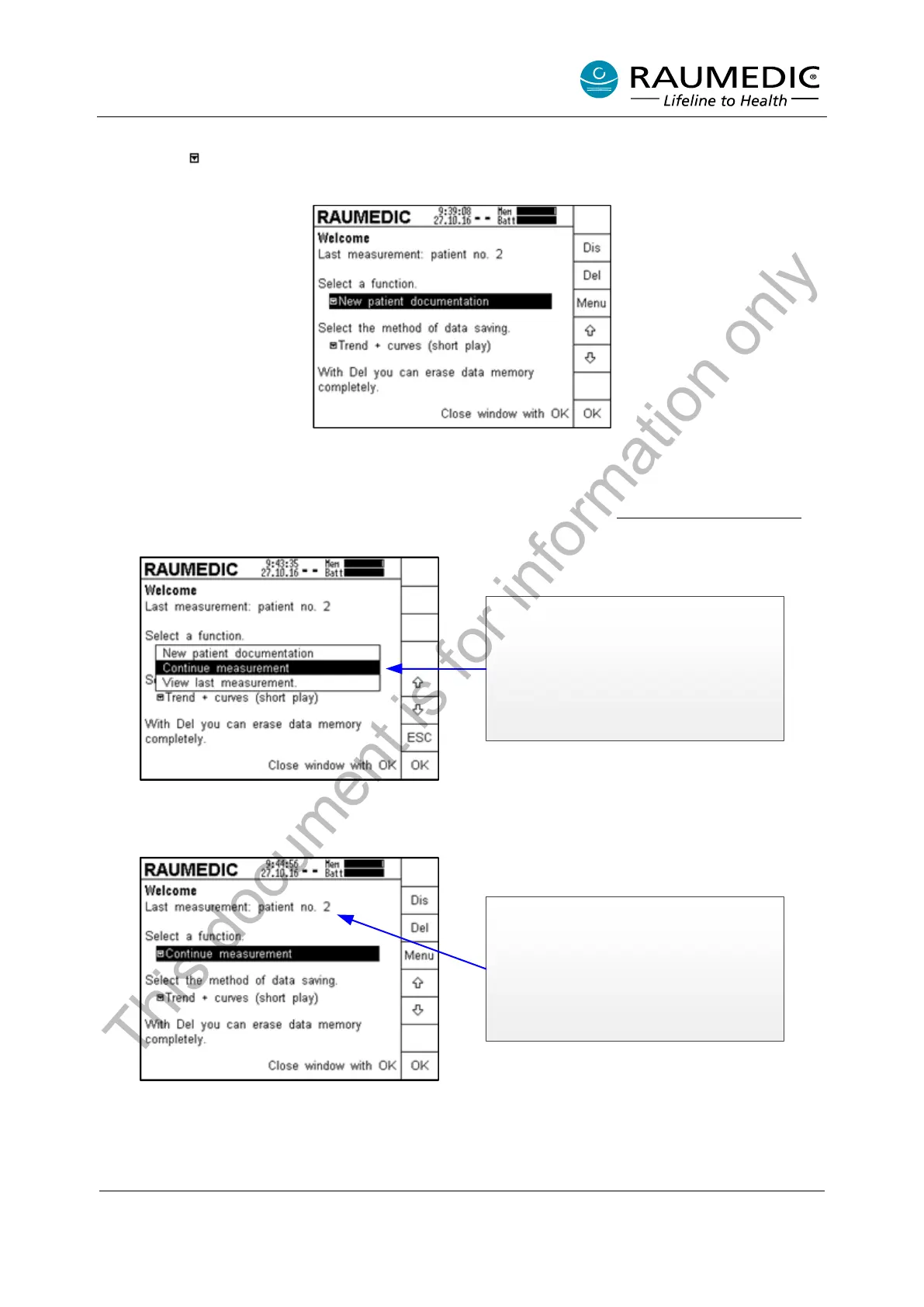 selection of the memory mode. If you want to continue with the last patient, press the Menu key first of all.