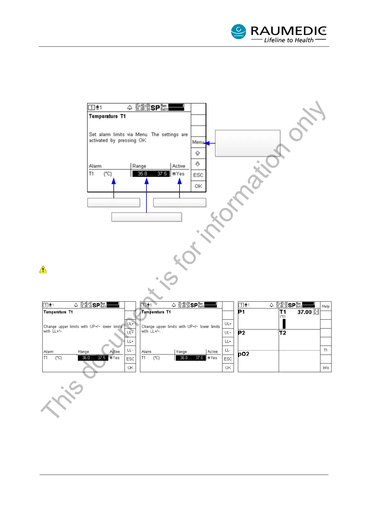 Do not set the limiting values to extreme figures which could render the alarm system useless.