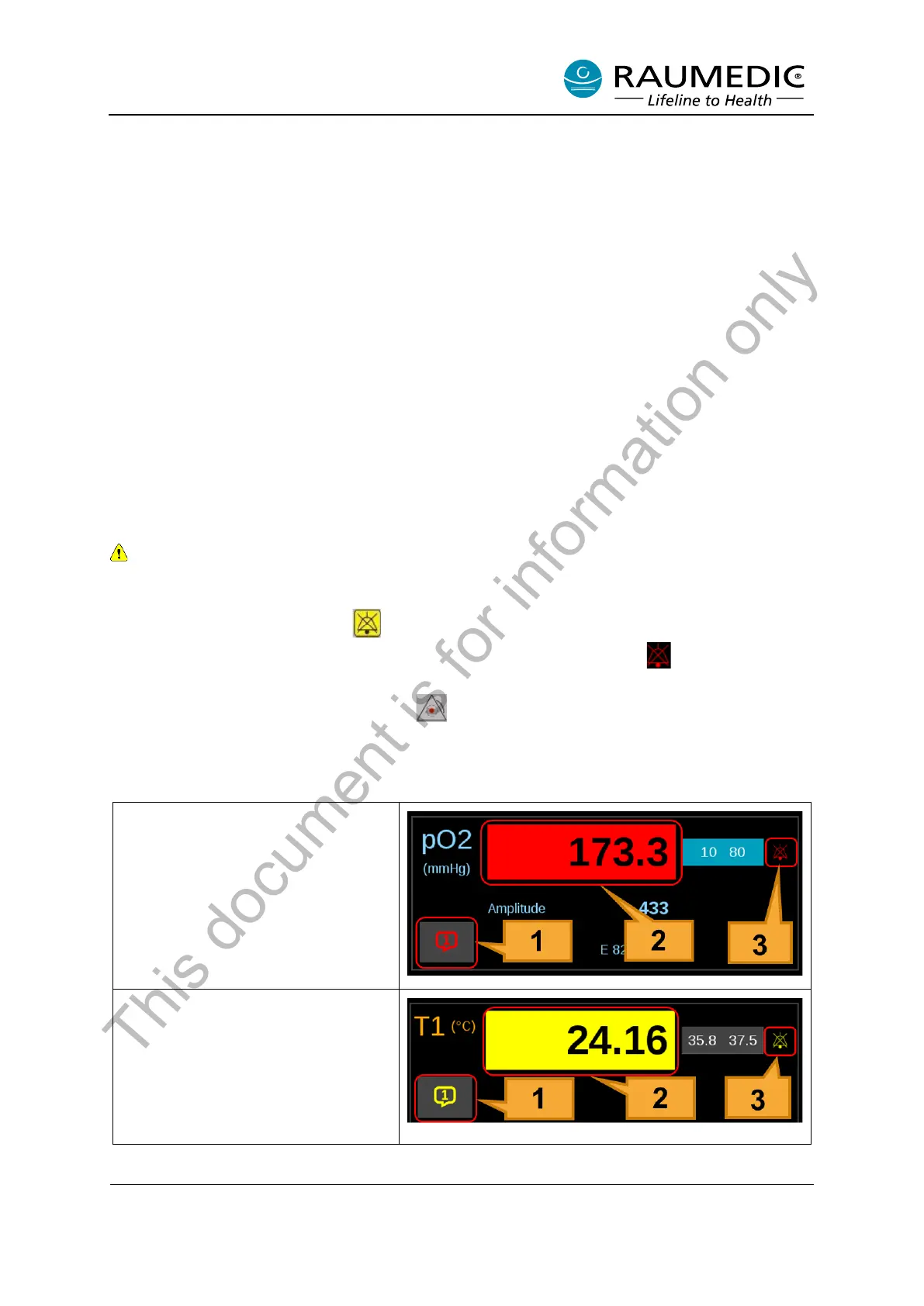[3] flash). For a medium-priority physiological alarm, the symbols are accordingly yellow. See Table 15.