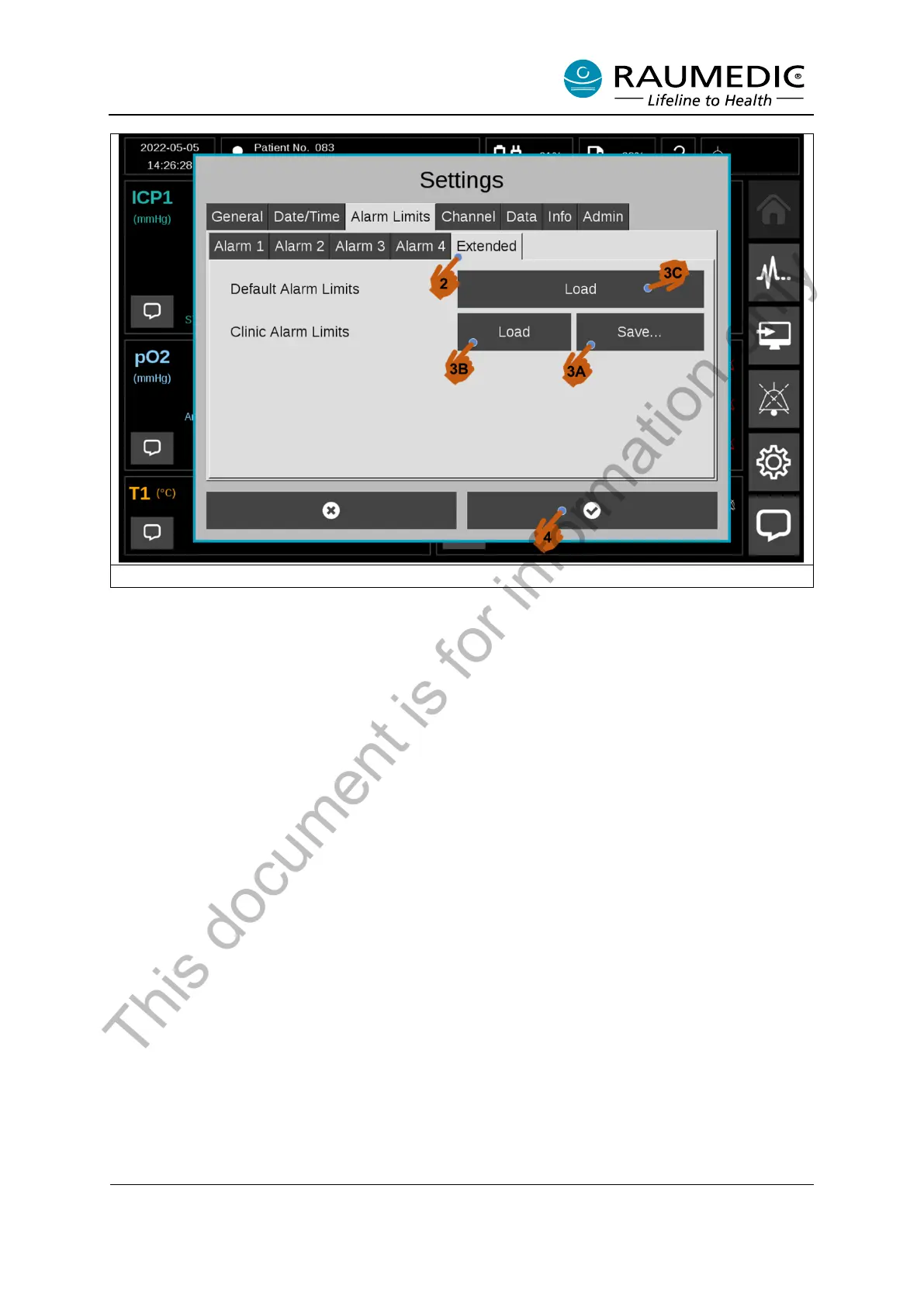 button 3B. The default alarm limits shown in can be loaded by pressing the upper Load button <3C>.
