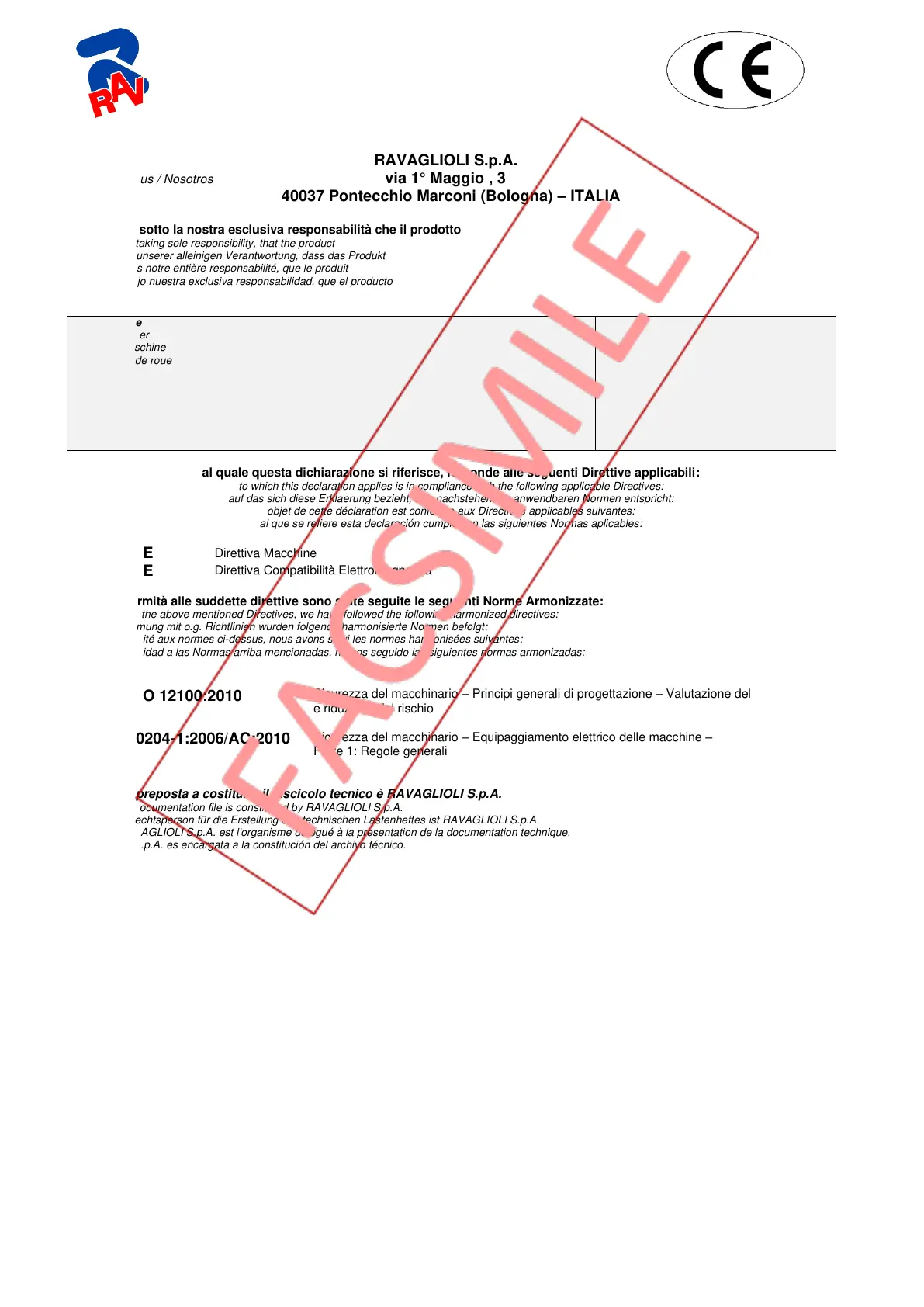 The technical documentation file is constituted by RAVAGLIOLI S.p.A.