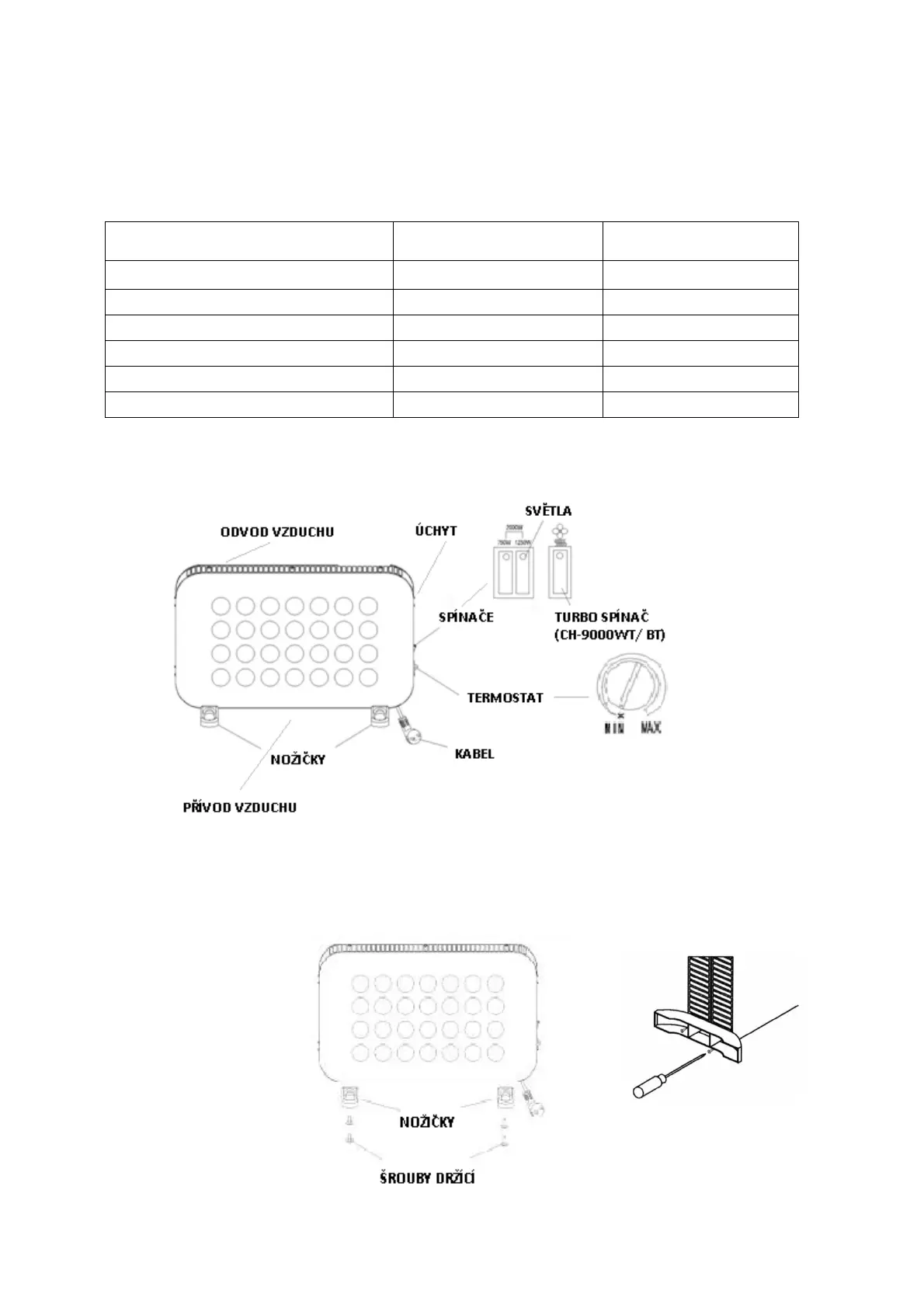 Před prvním spuštěním, musíte dodanými šrouby připevnit k dolní části konvektoru nožičky.