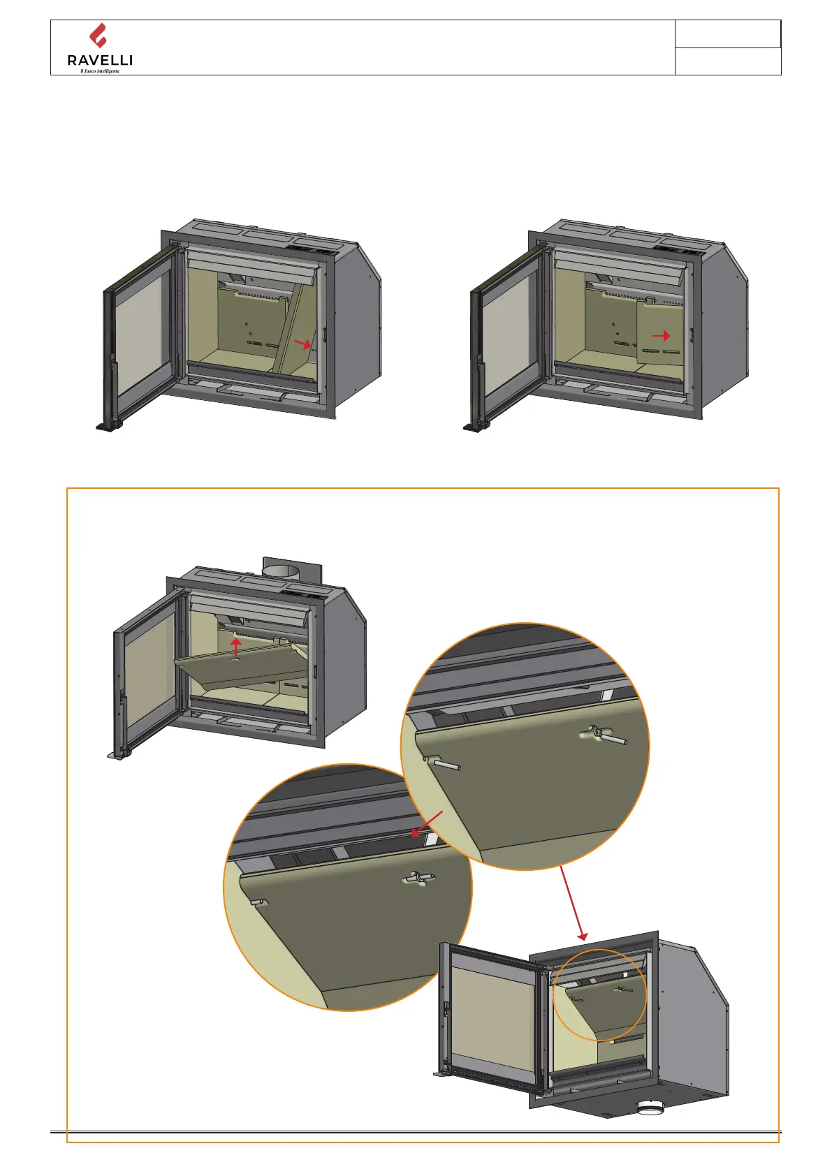Die untere Rauchumlenkplatte montieren. Die Rauchumlenkplatte muss von den Rückplatten gestützt werden.