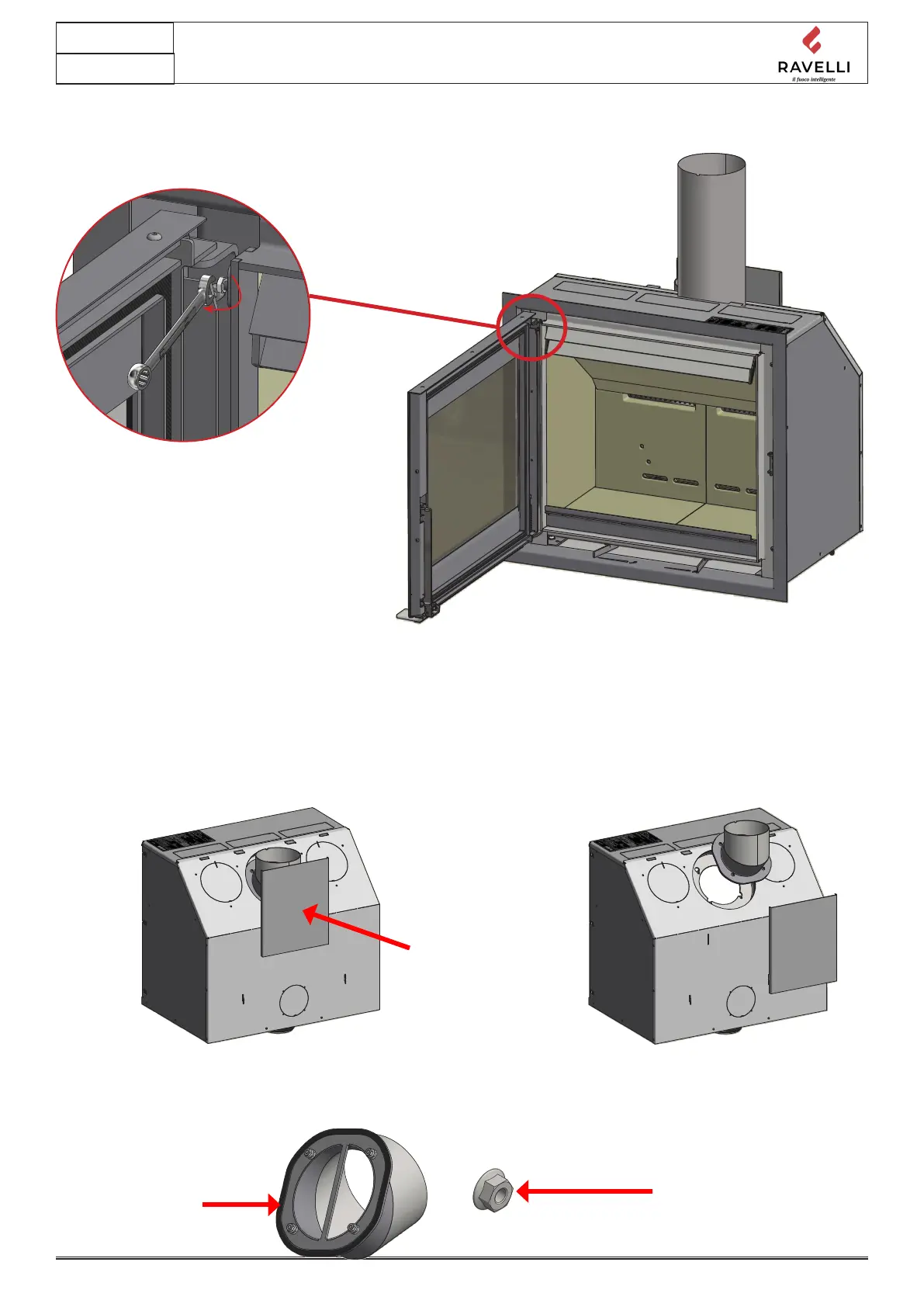 Der Hersteller liefert den Einsatz für den oberen Ausgang vorbereitet. Montare il raccordo sull’inserto, una volta collocato nella casset-