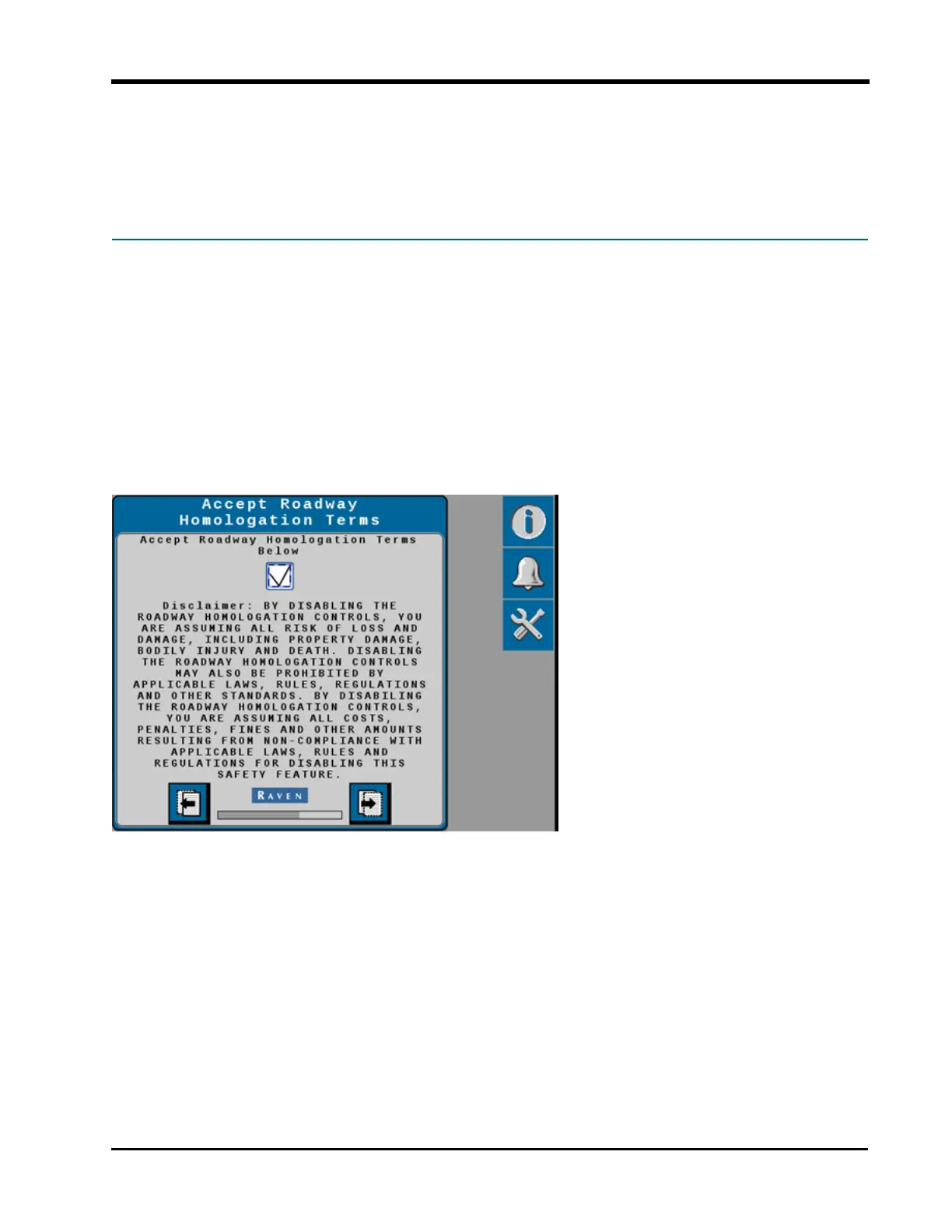 The Accept Roadway Homologation Terms page will be displayed during the initial calibration
