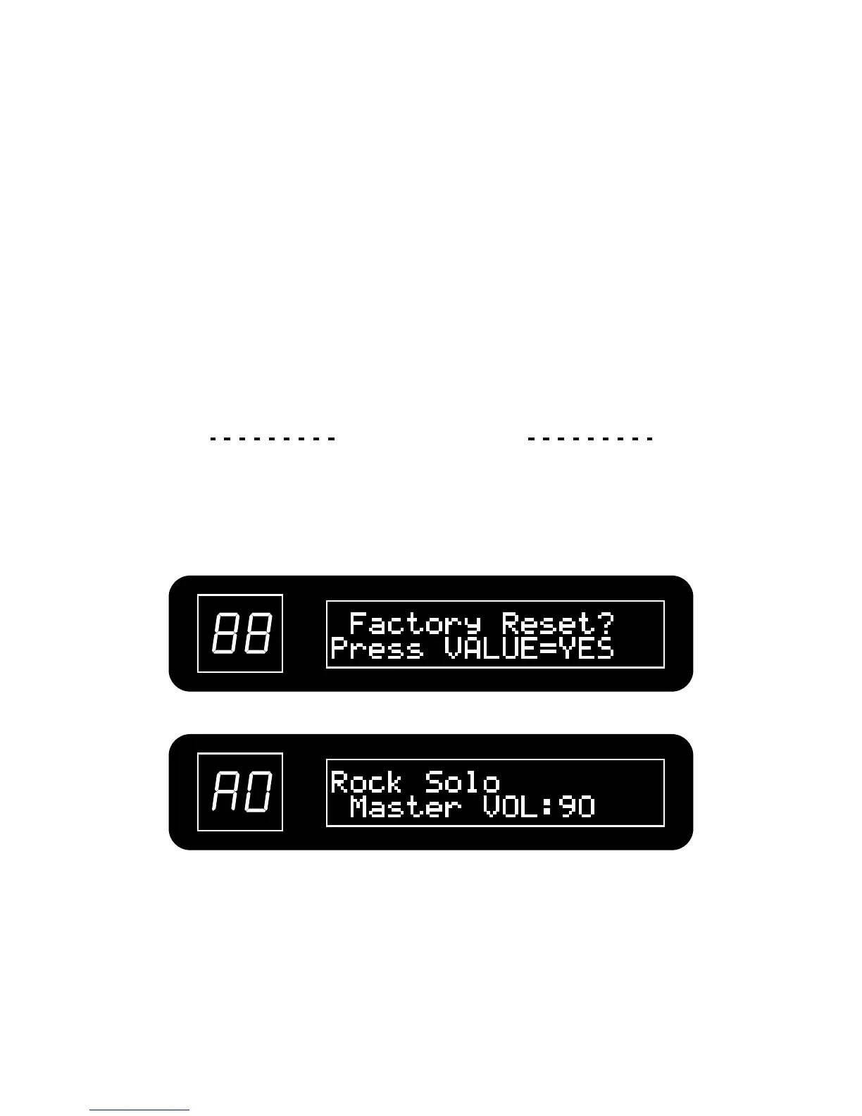 Press VALUE button to restore all patches to their factory settings and return to play mode.