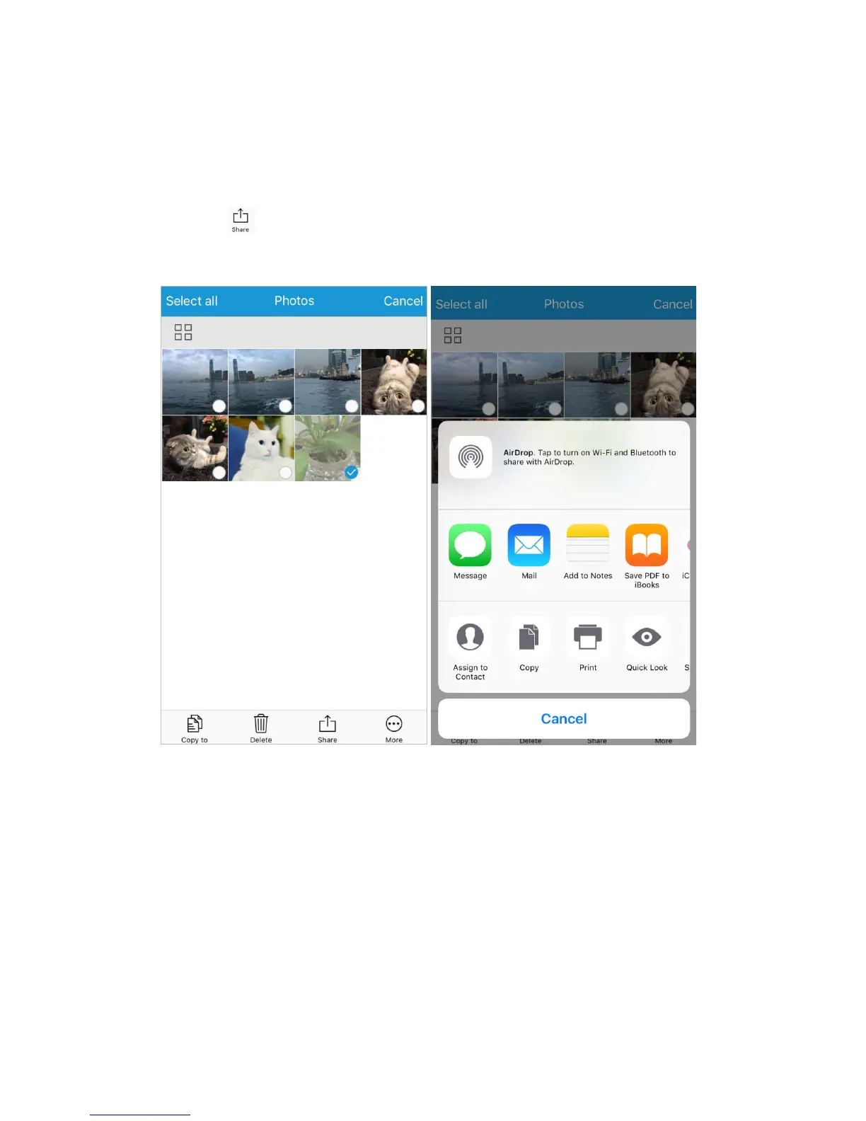 • Tap the sharing icon to share photos, videos and documents. You can