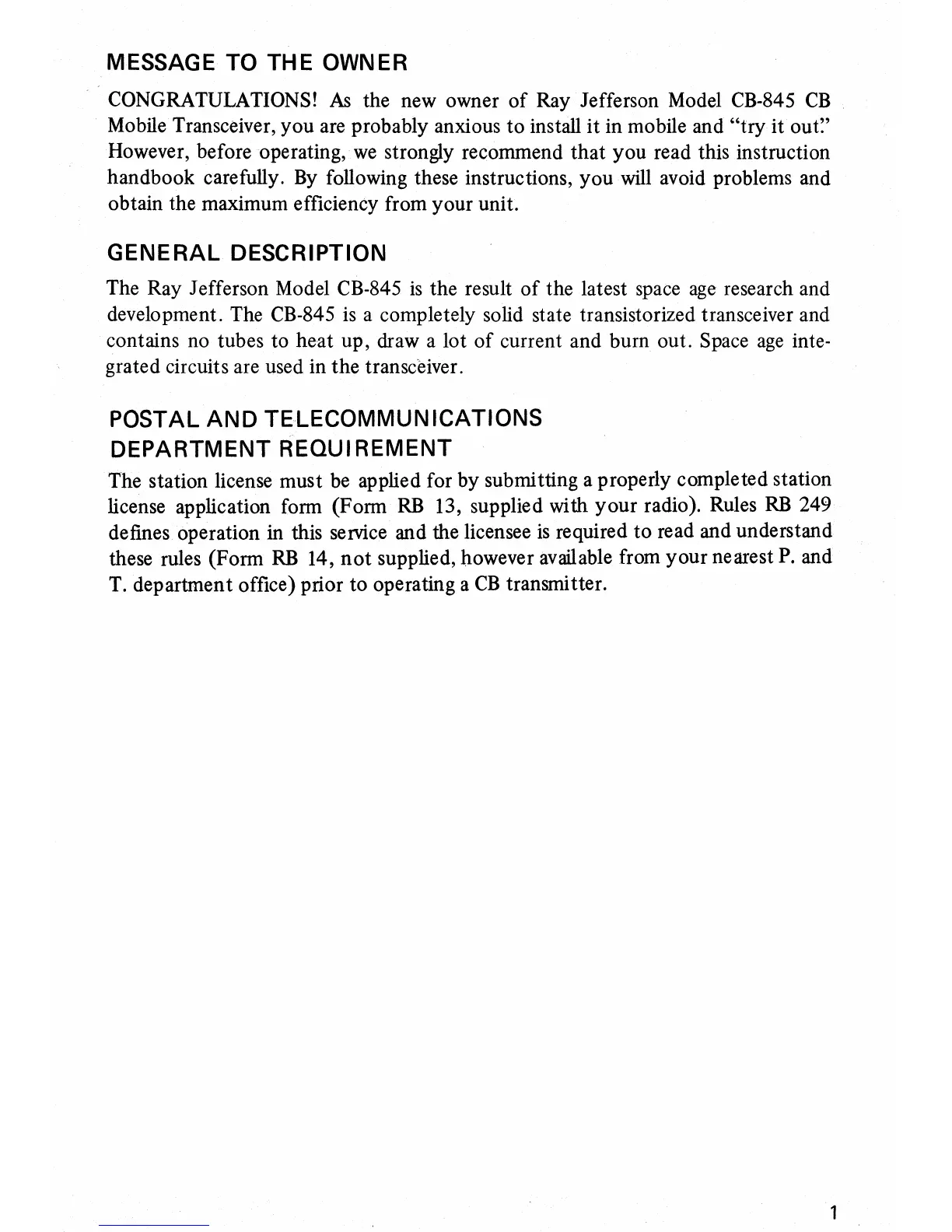 CONGRATULATIONS! As the new owner of Ray Jefferson Model CB-845 CB
