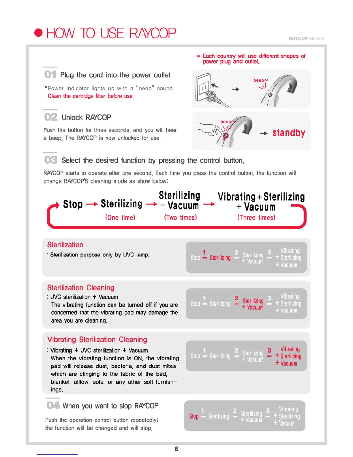 raycop BK-200 - How to Use; Sterilization; Sterilization Cleaning; Vibrating Sterilization Cleaning