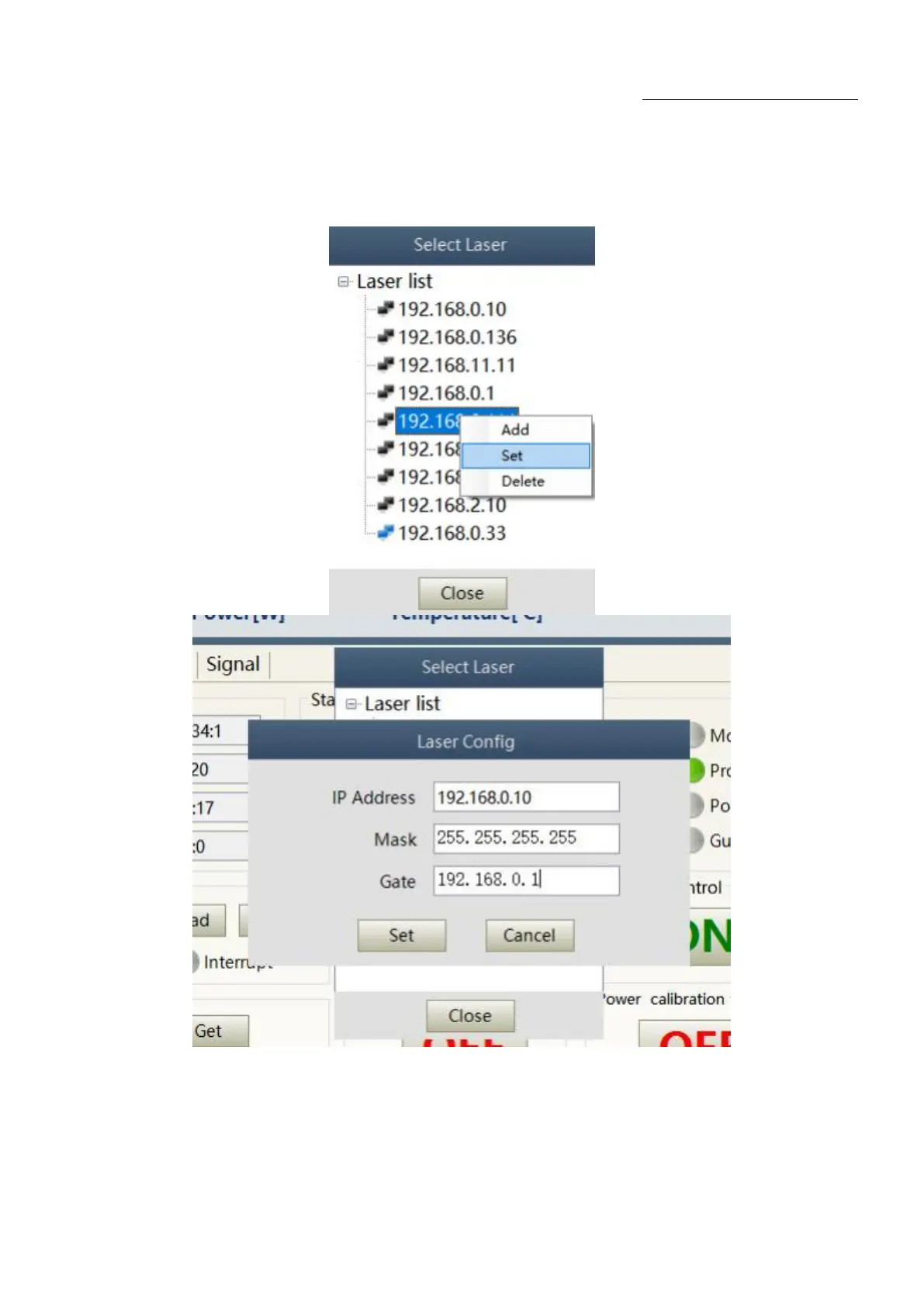 After the laser connection has established, select the IP address of current laser and right-click to set