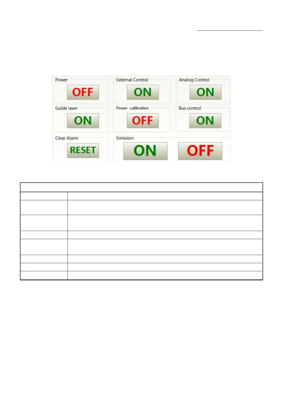 Table 15 Laser power-on, mode selection, light out control display area explanation