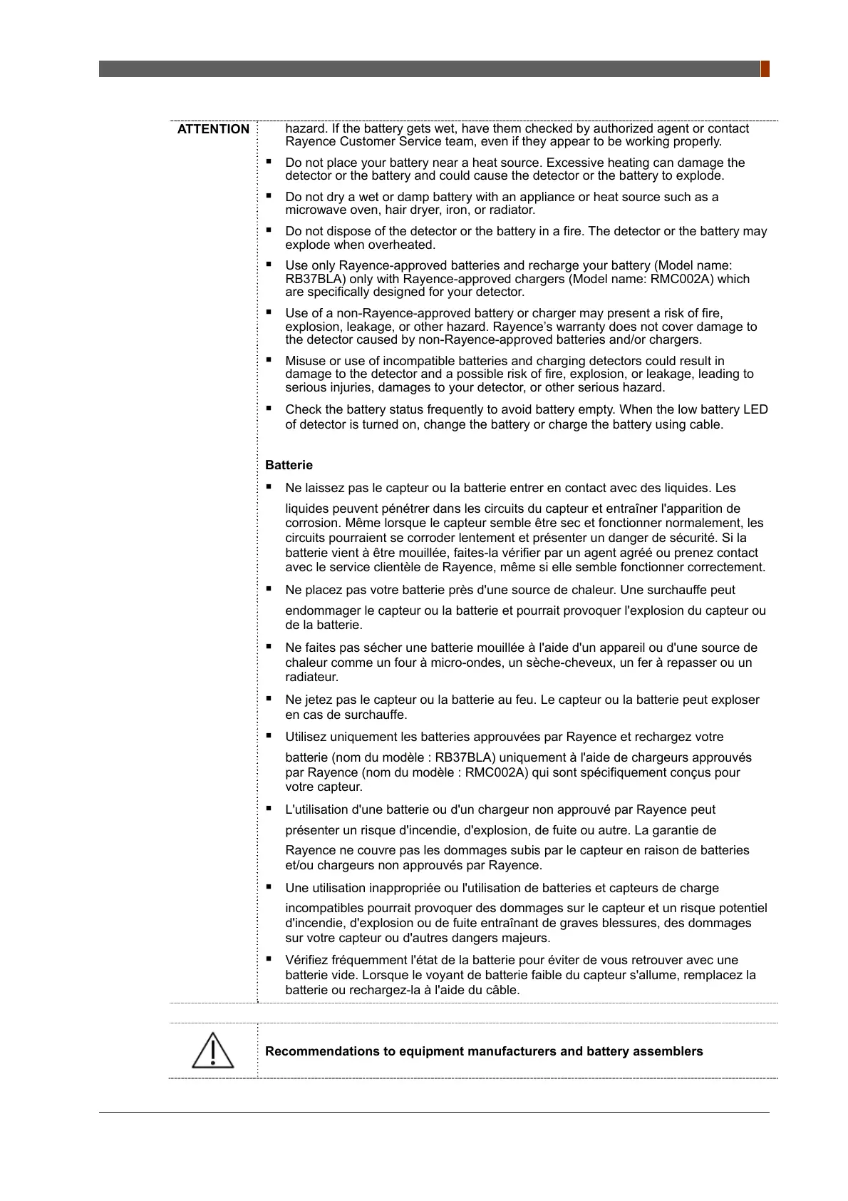 Use of a non-Rayence-approved battery or charger may present a risk of fire,