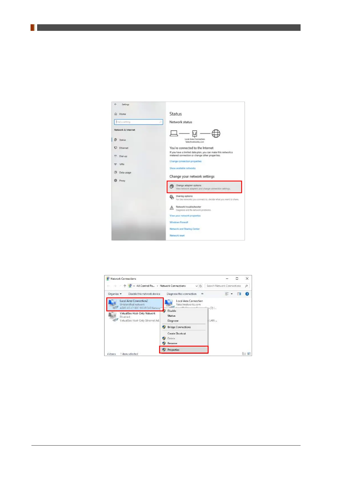 • Desktop > Network Icon > Right click > Properties > Change Adaptor Settings