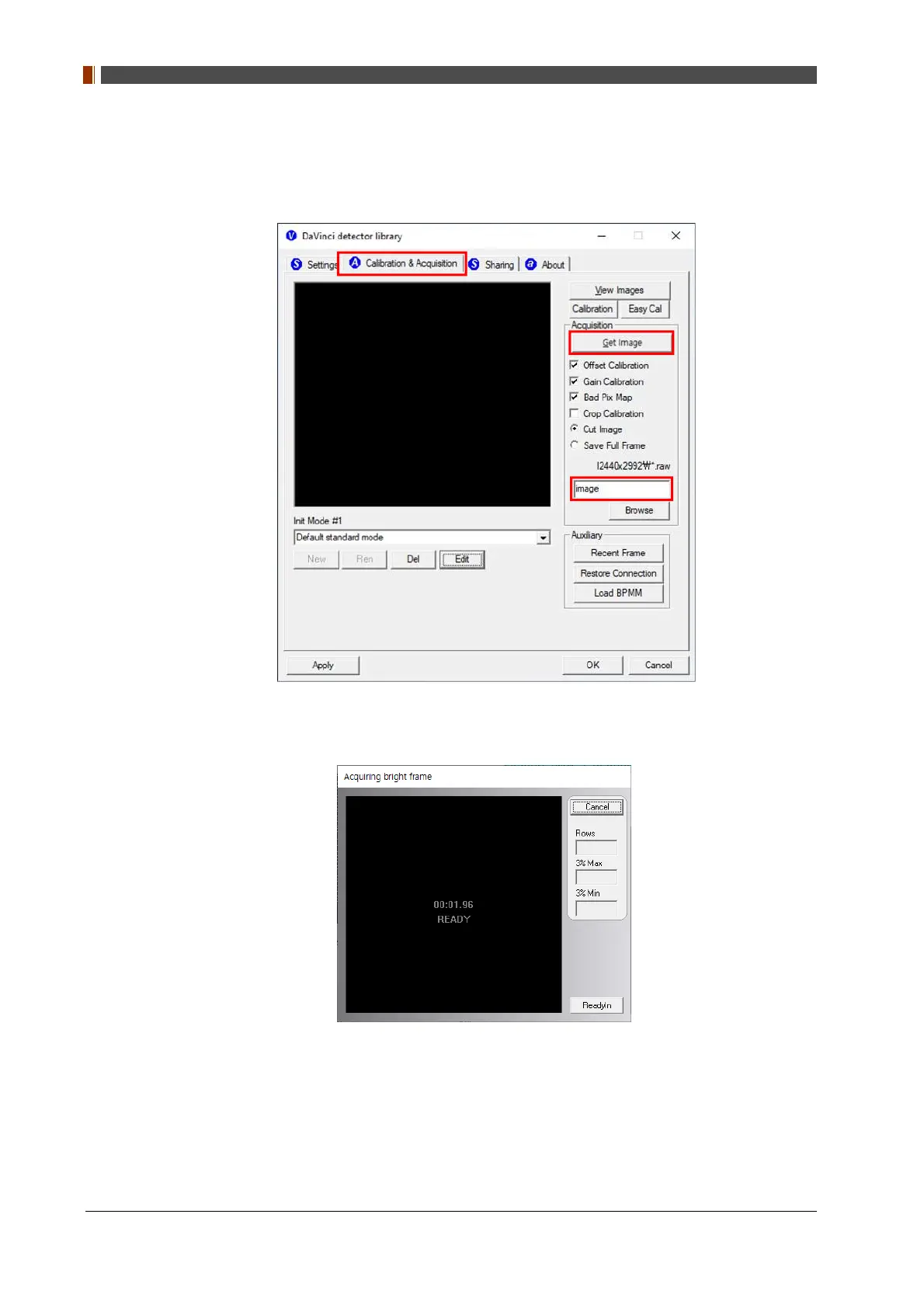 2. Shoot an X-ray once the "Acquiring bright frame" window pops up.