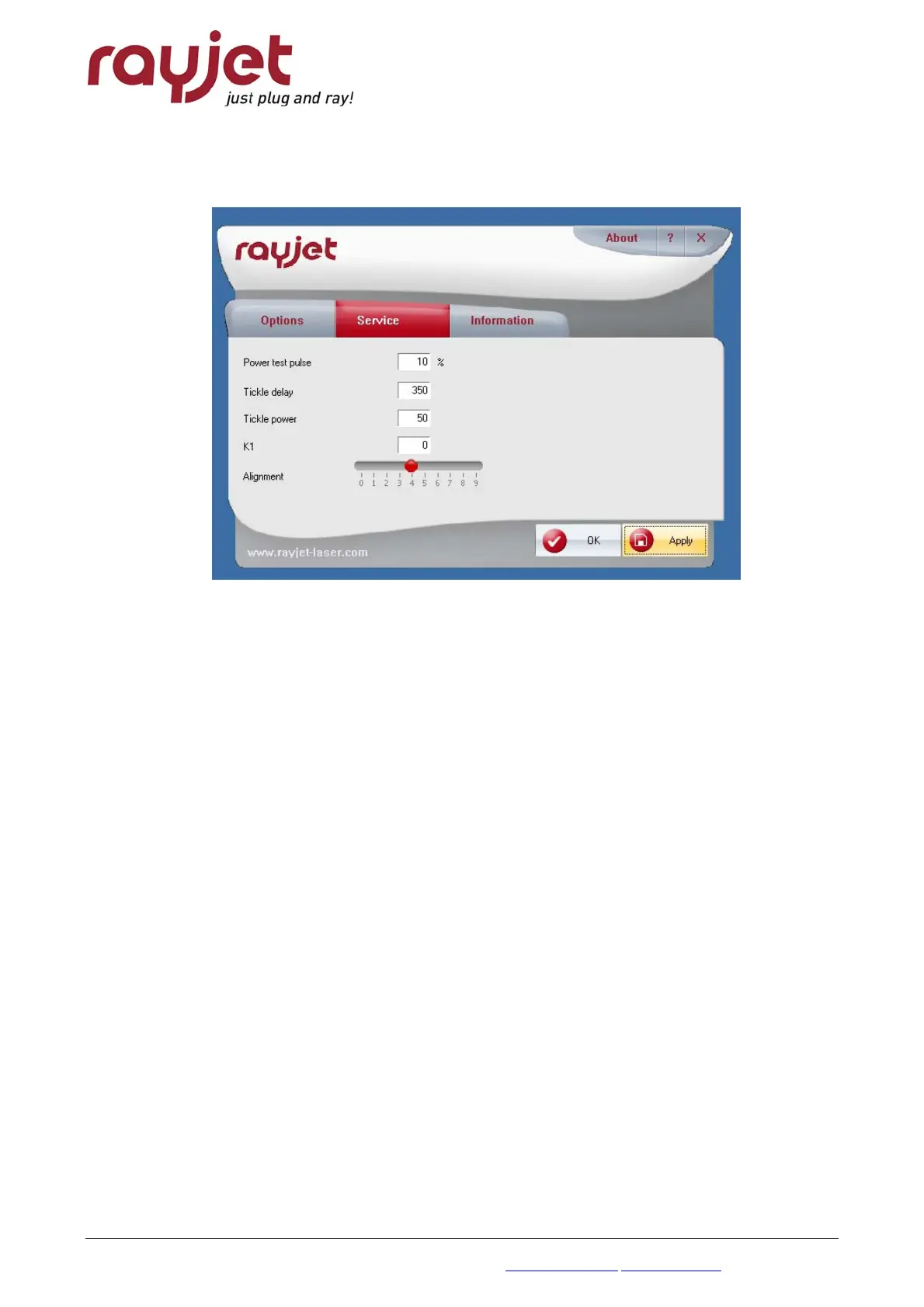 Choose “Service” and set “Power test pulse” to 100%. Press Apply.