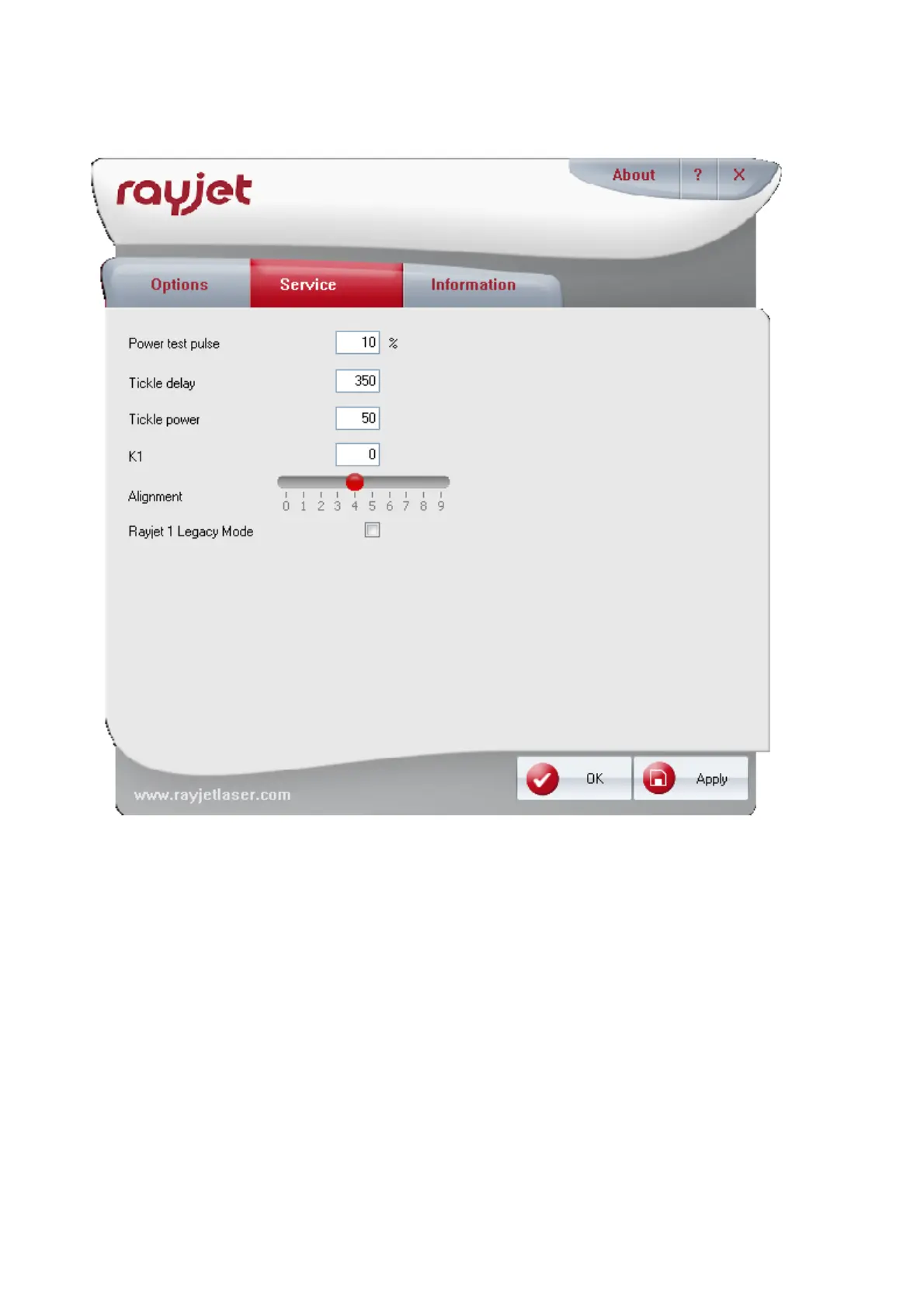 To find out the correct settings for K1 and Alignment, engrave the test pattern and choose the jobs