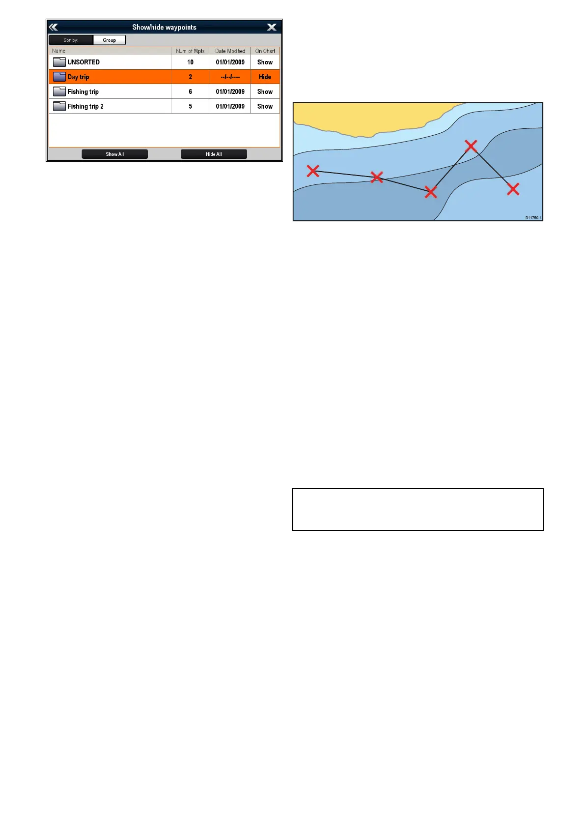 •Chartapplication:Menu>MyData>Waypoints.