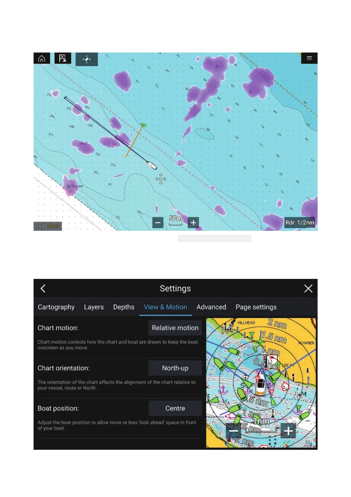 Theviewandmotiontaballowsyoutocontrolhowthechartisdisplayedinrelationtoyourvessel.