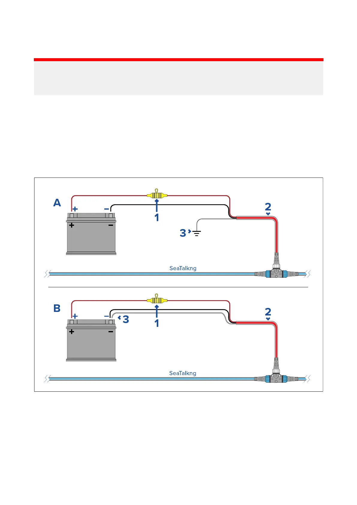 - SeaTalkng ®配電盤への接続が不可能な場合、電源ケーブルを船舶のバッテリーに接続することができます。