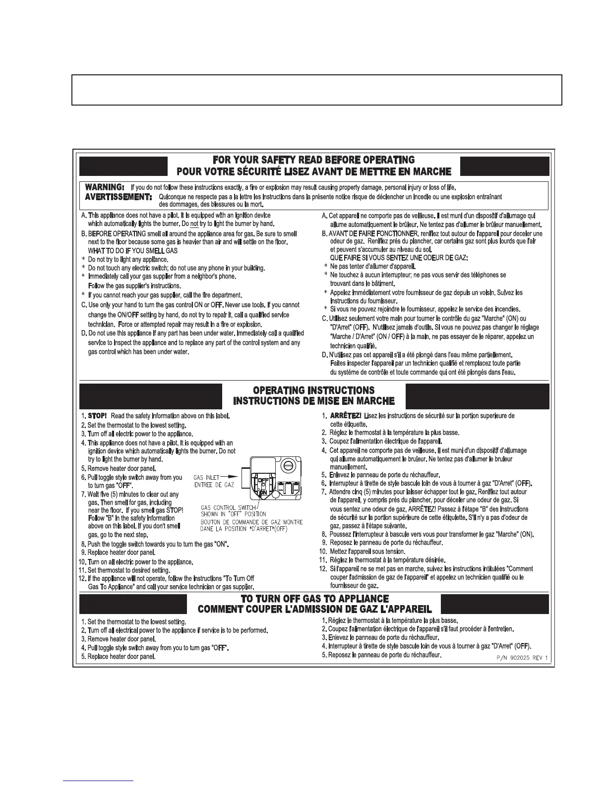 WARNING: Should overheating occur or the gas supply fail to shut off, turn off the manual gas control to the
