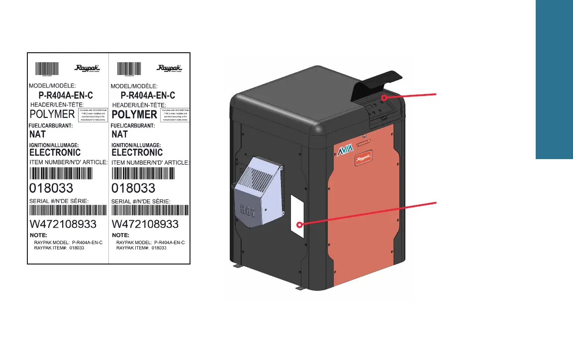 Raypak AVIA 264 - Model Number and Serial Number Location; Model & Serial number located on carton label.; Model & Serial number can also be found inside the bezel above digital display.; Model & Serial number located on rating plate.
