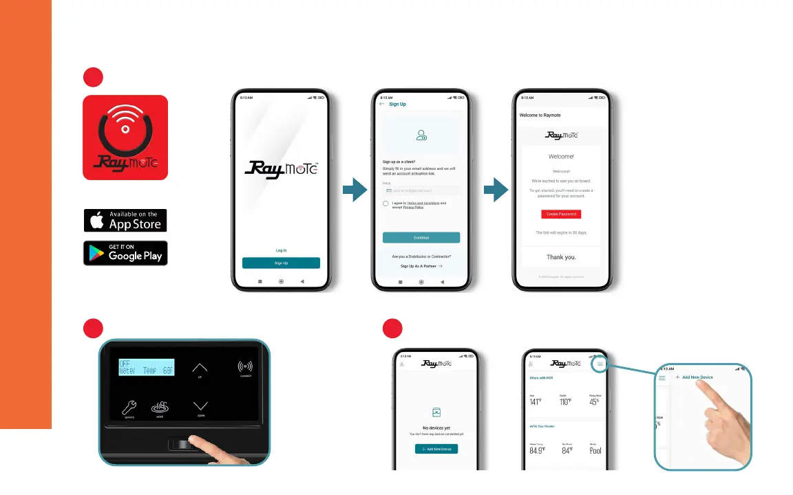 Raypak AVIA 264 - Raymote - Quick Start Guide; Sign-Up with the Raymote App; Turn on the AVIA Heater; Add New Device to Raymote App