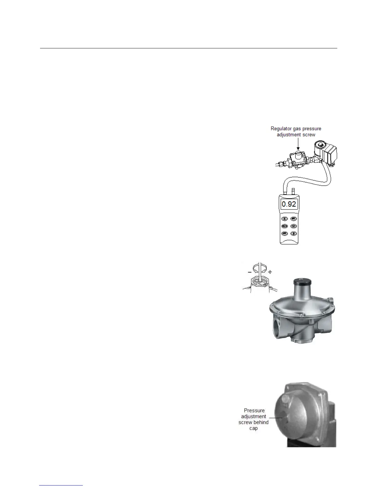 5. Adjust pilot gas pressure to 0.92 kPa for natural gas or 2.75 kPa for propane. To