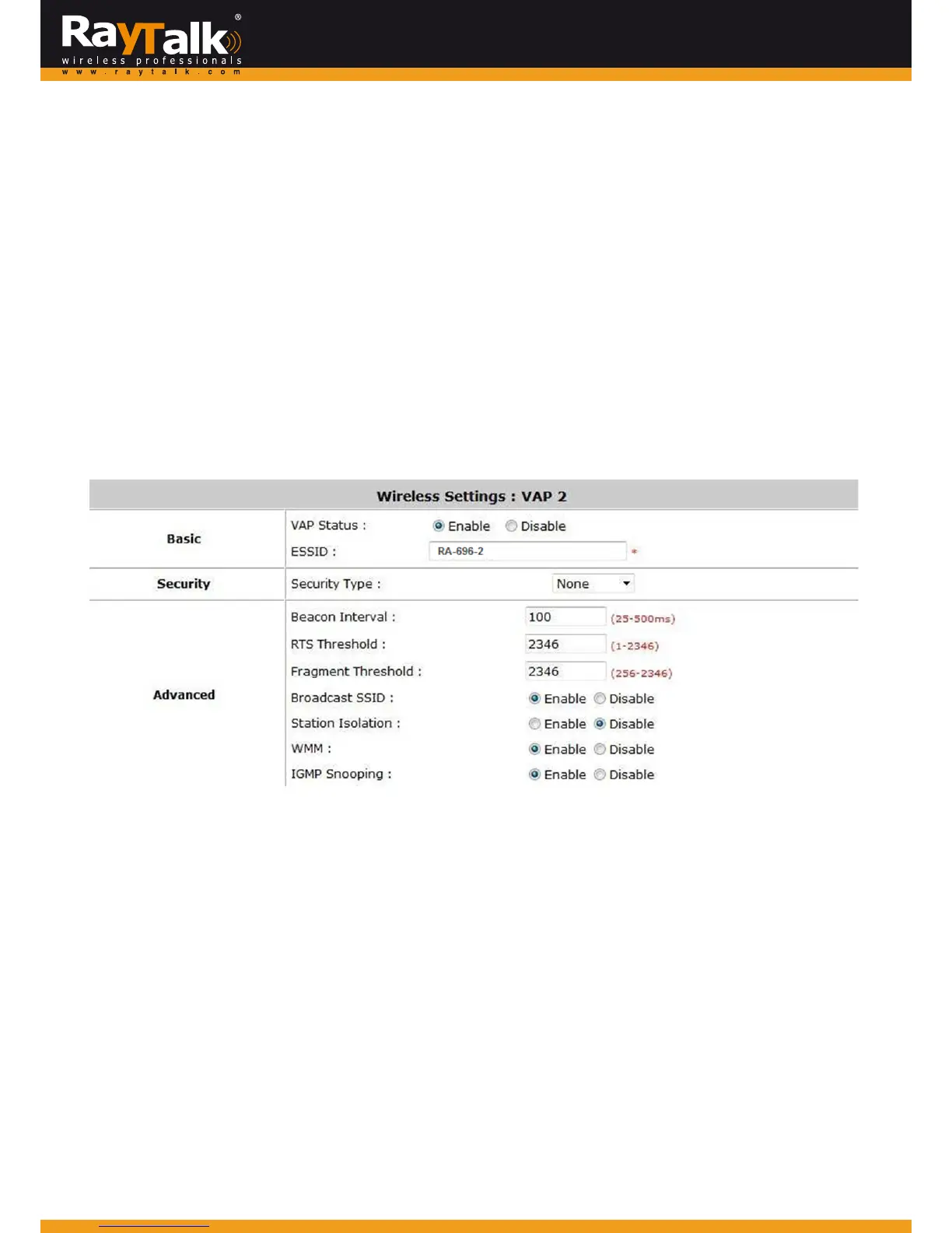 Basic: Enable the VAPStatus if you wish to provide wireless serviceunder this zone.Assign an ESSID for VAP2 under