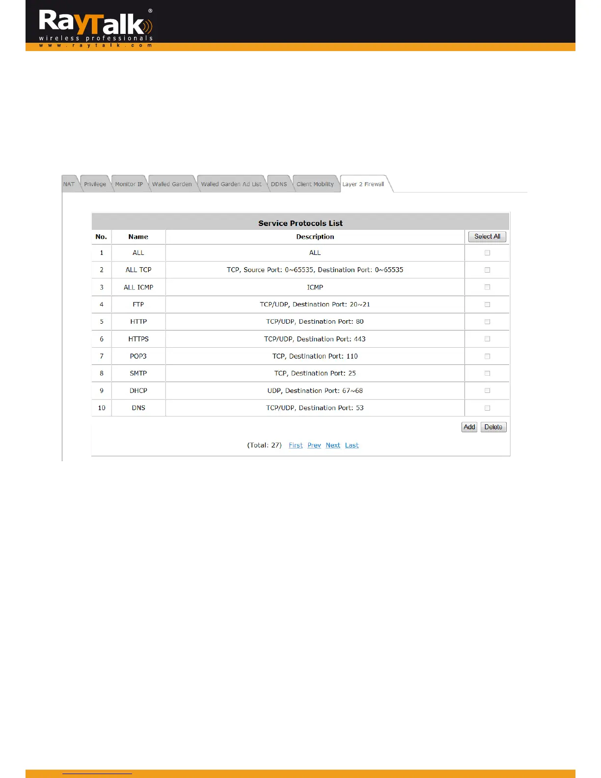 The administratorcan add or delete firewallservice protocolshere; the ser vices on this list will become available dropdown