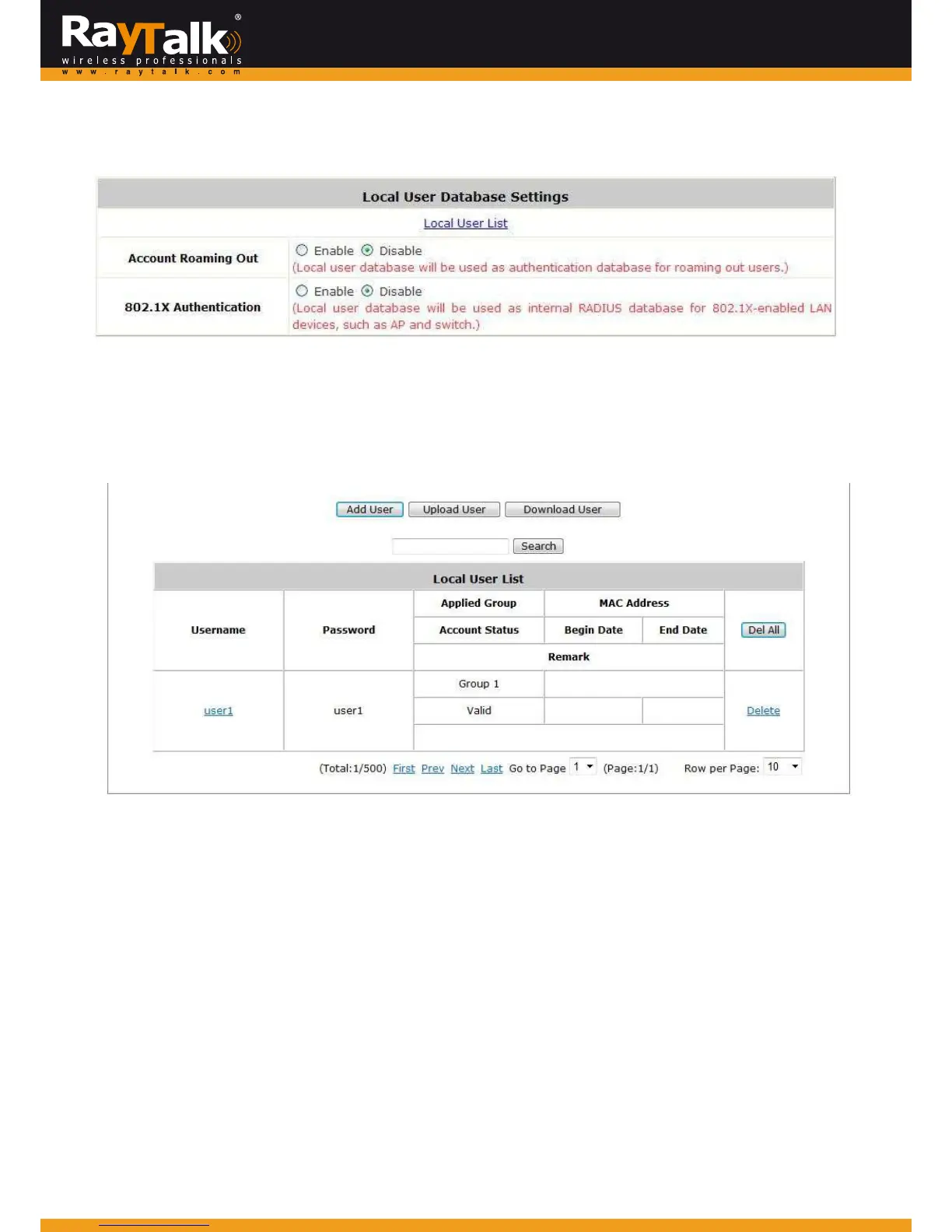 Local UserList:It allowstheadministratorto view,addordeletelocaluseraccounts.The UploadUser buttonisfor