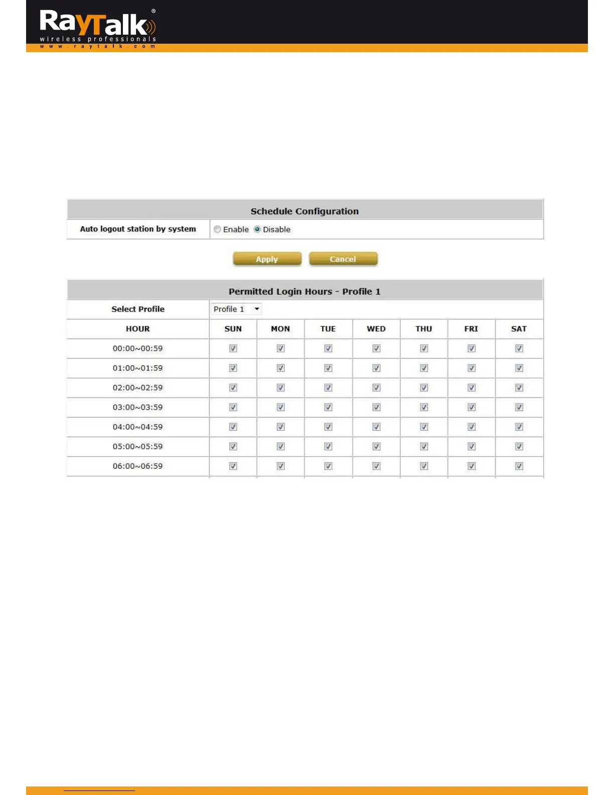 Thisfunctionisused tolimitthetim ewhenclientscanlogin.Checkthedesiredtime‐slotcheckboxesandclickApplytosavethe