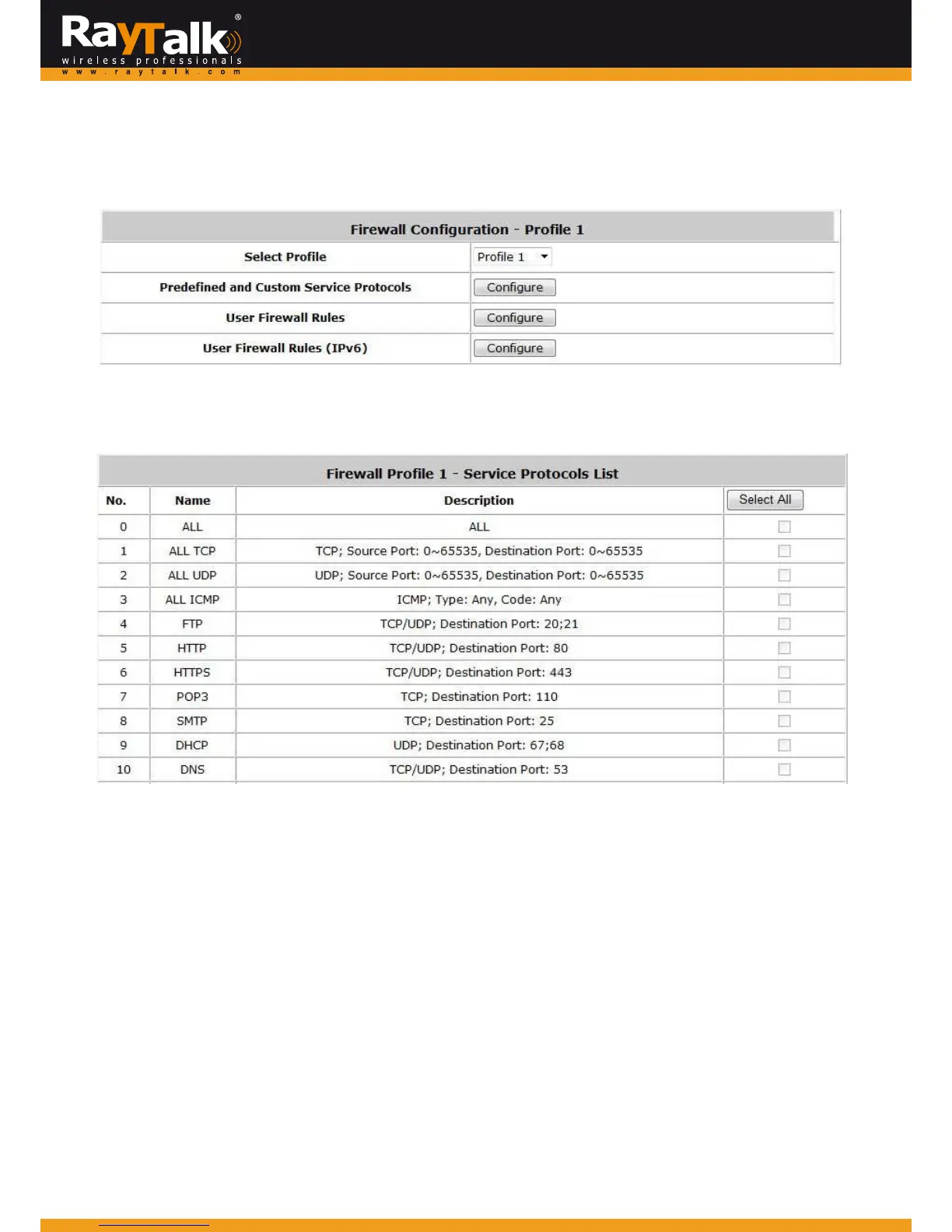 Service Protocols to edit the protocol list. Click Firewall Rules to edit the rules. Up to 5 profiles can beconf igured.