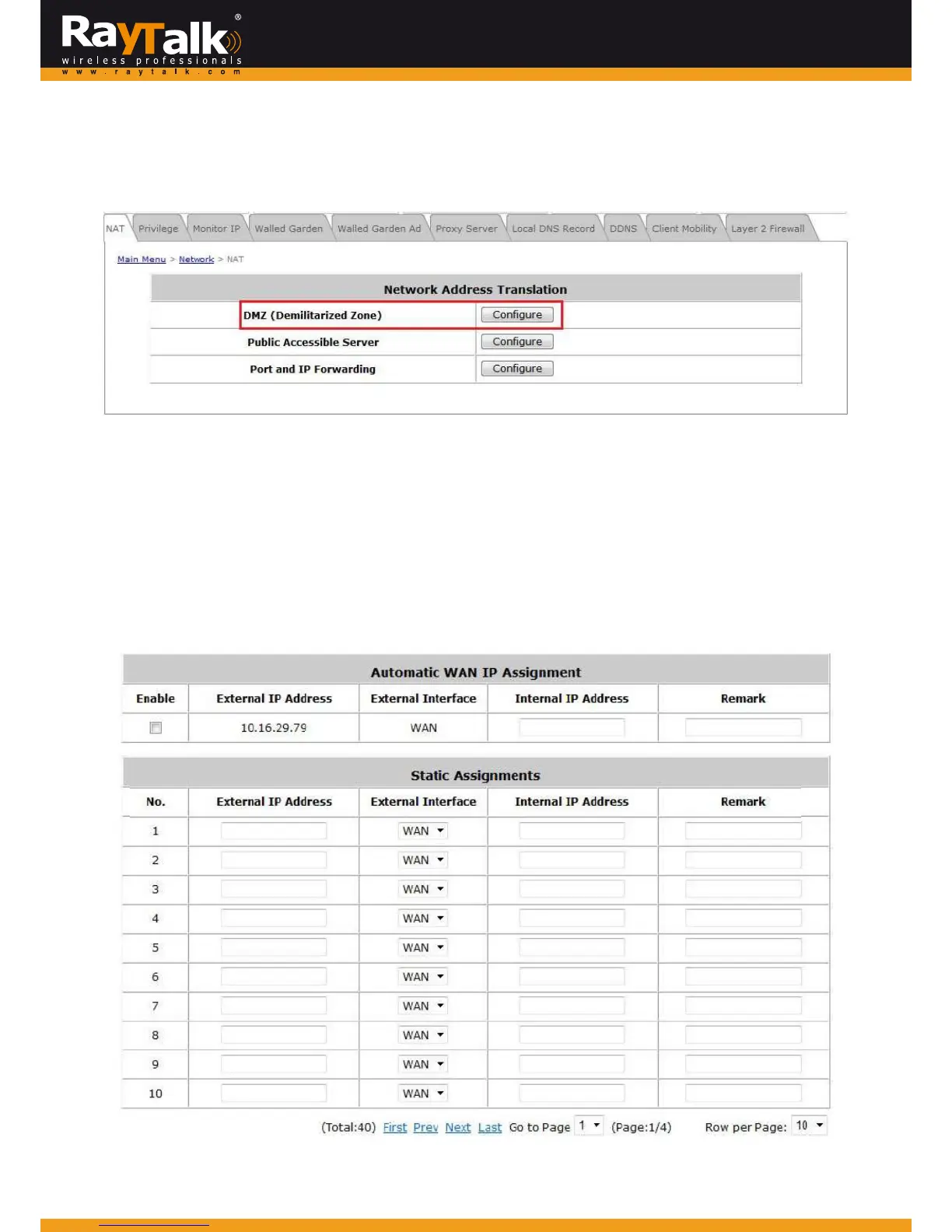 ToconfigureDMZ,goto:Network>>NetworkAddressTranslation>>DMZ(DemilitarizedZone).