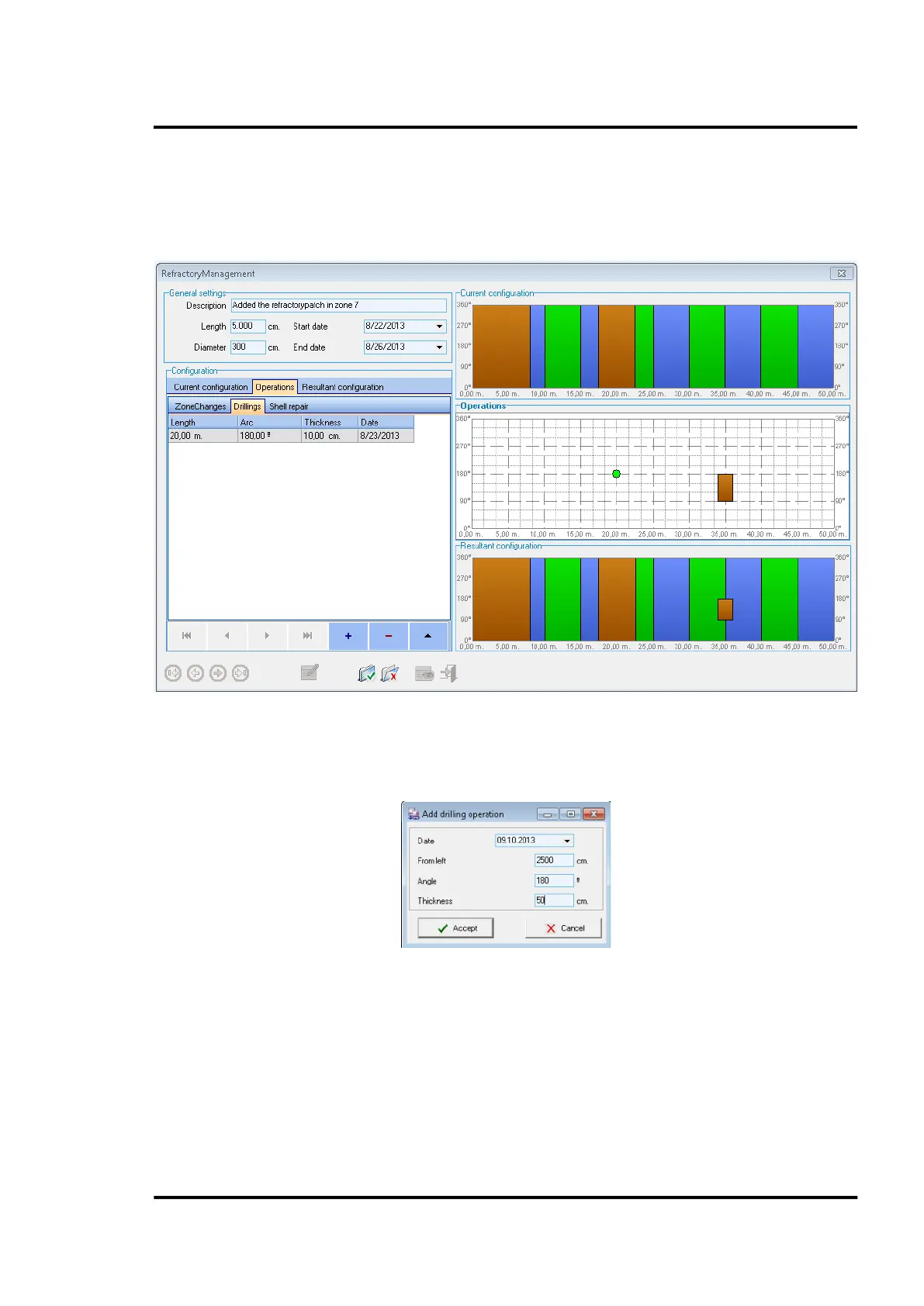 Within the dialog for adding/reviewing drillings, the user can define the date, position and thickness