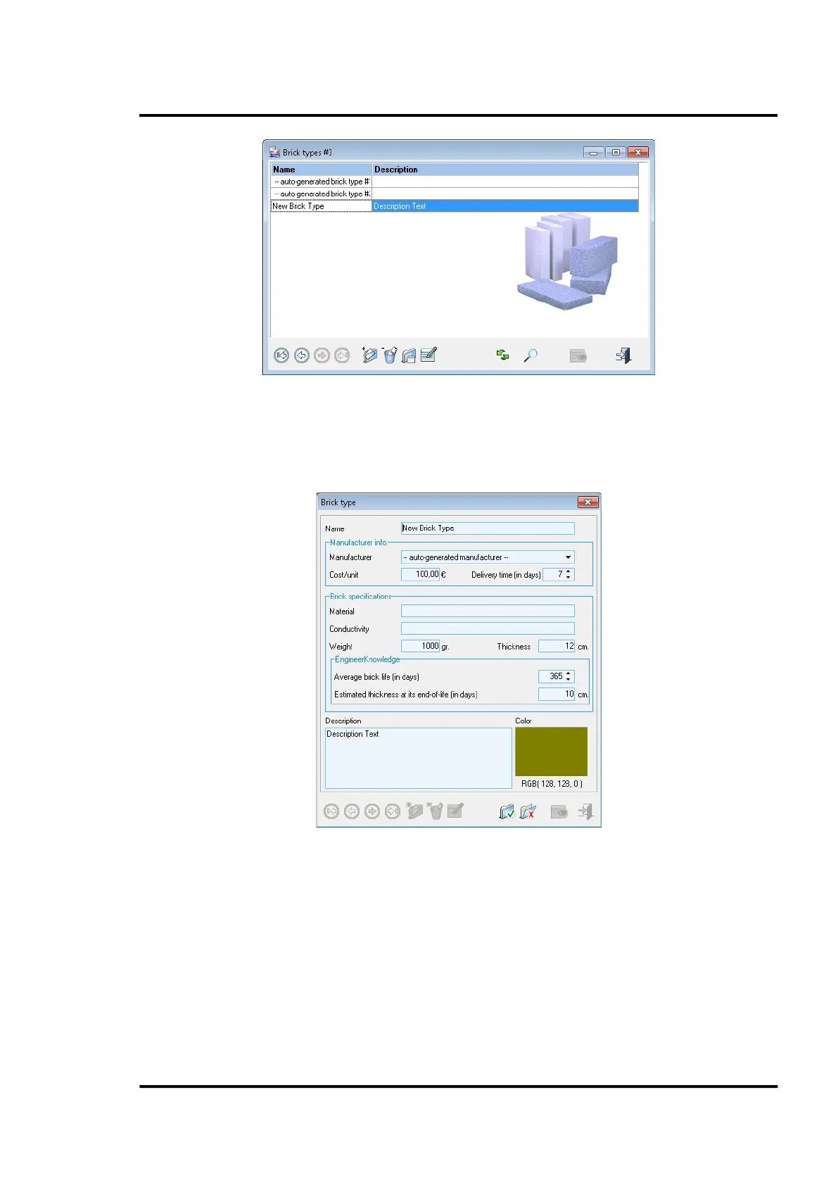 Within the dialog for adding/editing brick types, the user can consider the manufacturer’s brick