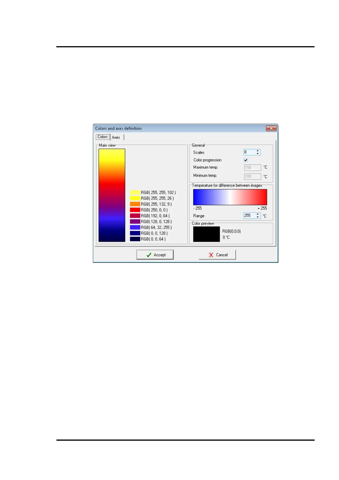 With this tabbed dialog box, the user can define their options for the thermogram colour palette. To