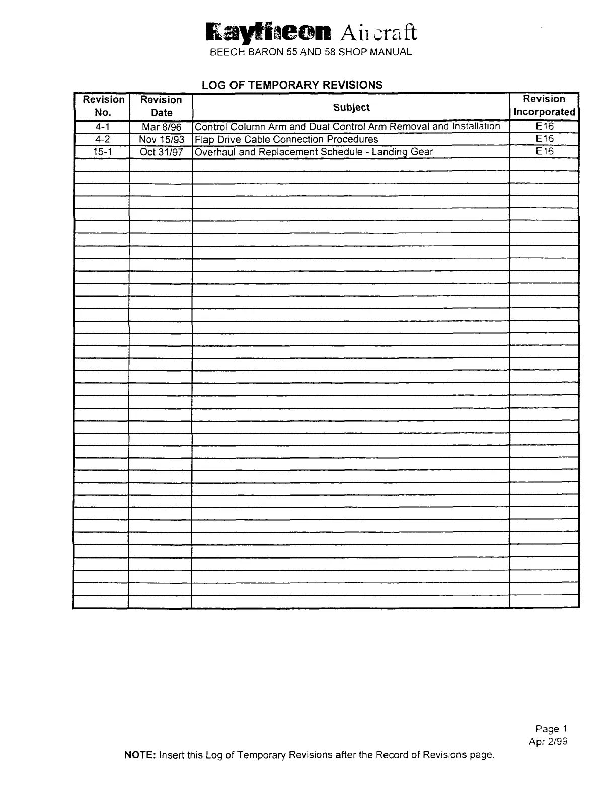 Raytheon Beech Baron D55 - Record of Temporary Revisions