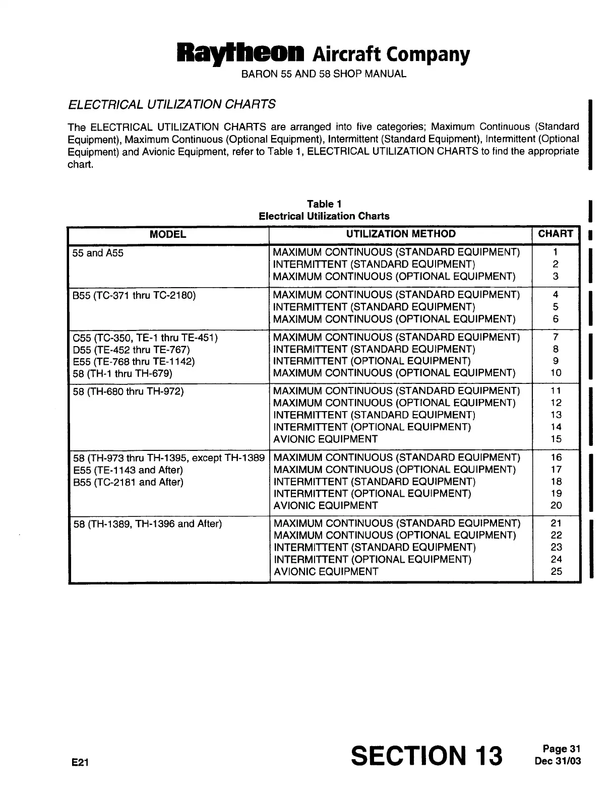 Raytheon Beech Baron E55 - Electrical Utilization Load Chart (Std Equipment)