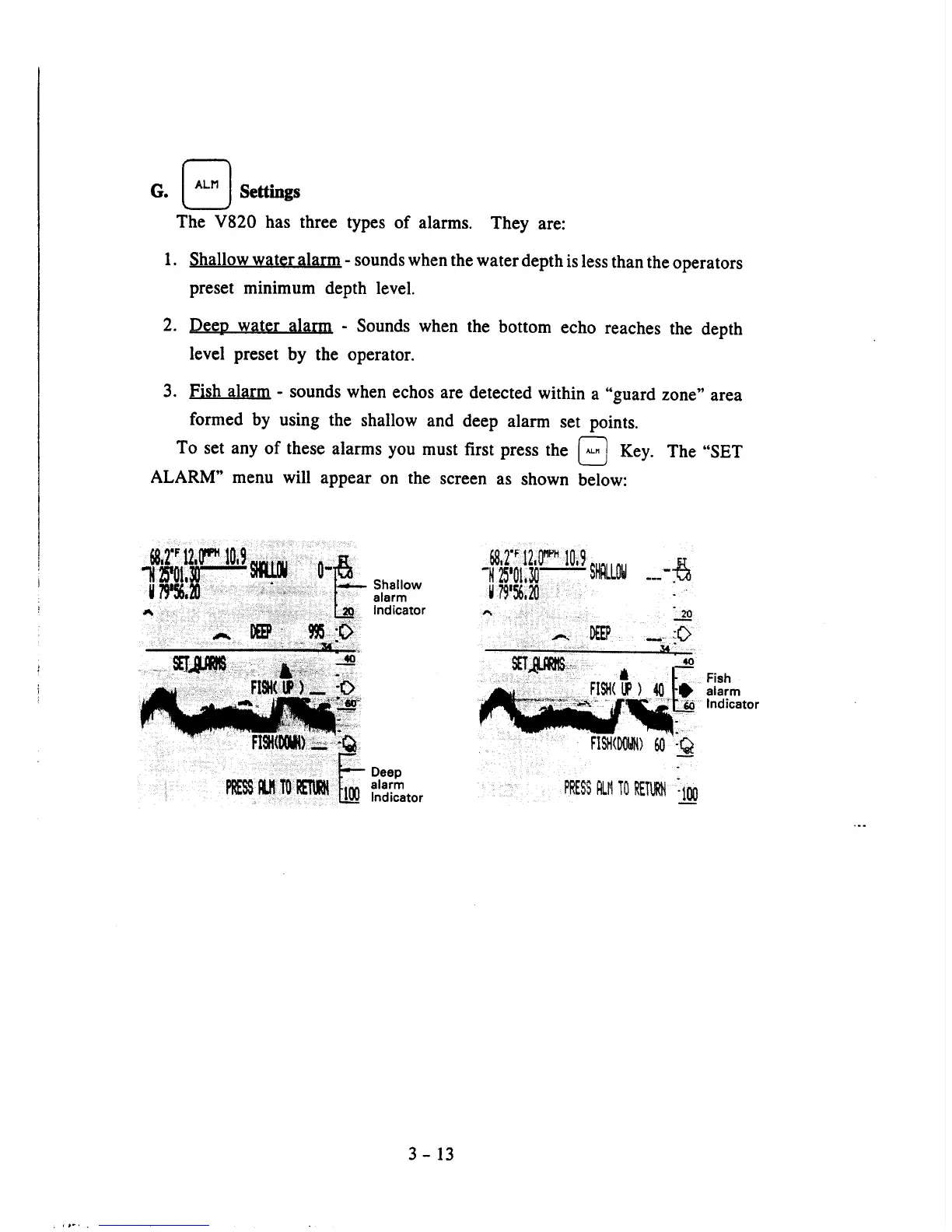 Raytheon V820 - Settings; Shallow Water Alarm; Deep Water Alarm; Fish Alarm