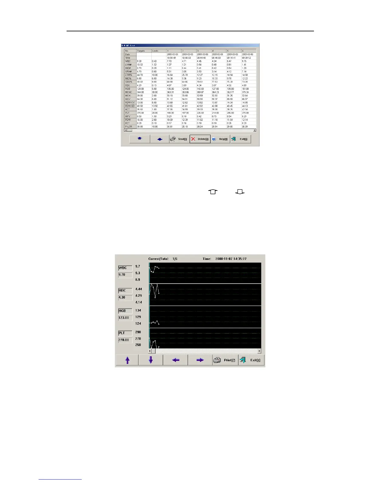 Each screen displays four-parameter QC chart. Three values on the left of QC chart are,